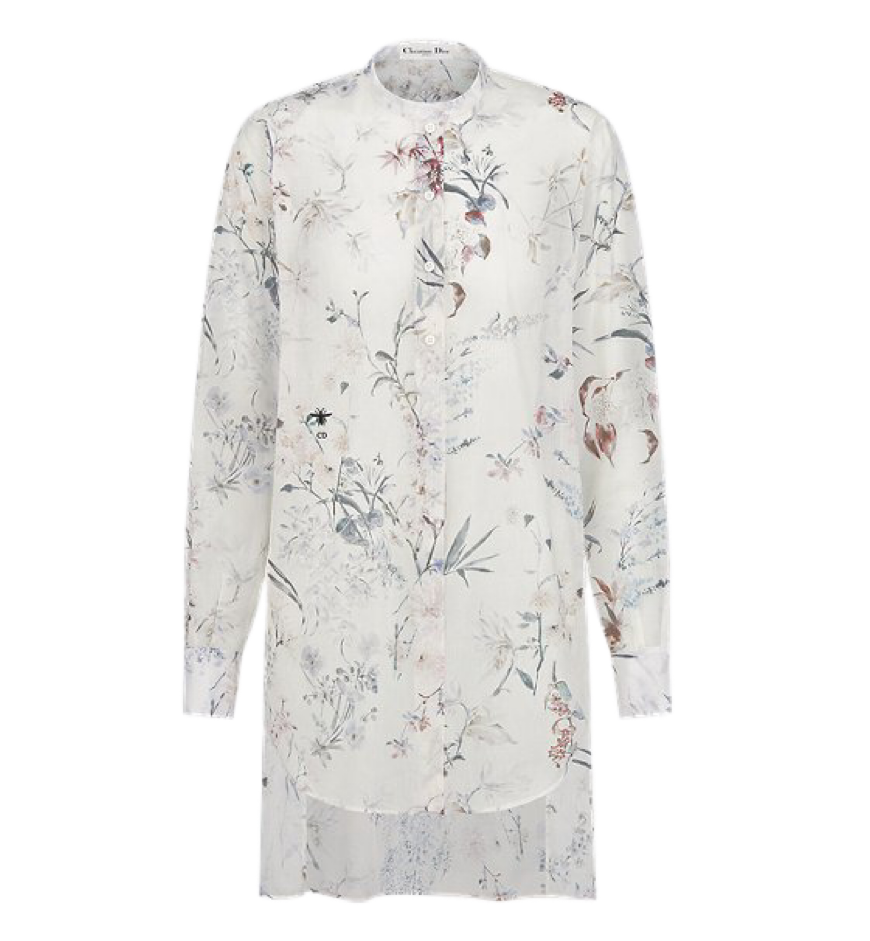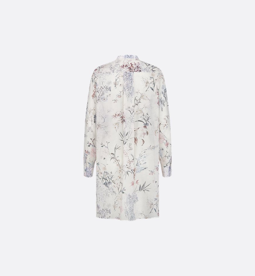 Блузка, являющаяся неотъемлемой частью Dior, украшена многоцветным мотивом Millefiori – изысканной композицией азиатских цветов в нежных и нежных оттенках. Изготовленная из белого хлопкового муслина, она дополнена современным кроем с удлиненной спинкой, офицерским воротником и застежкой на пуговицы спереди. Блузку можно носить с другими изделиями Millefiori.