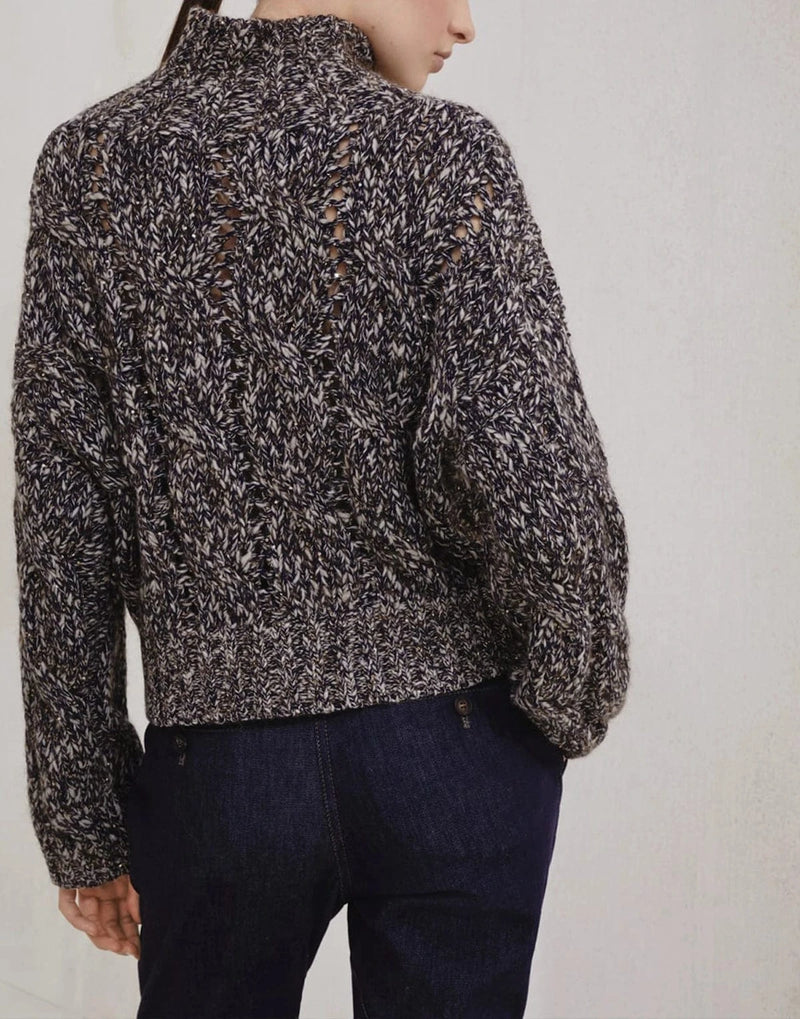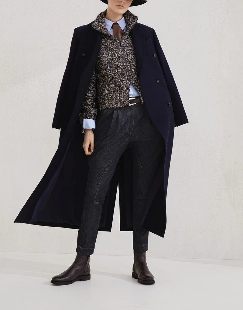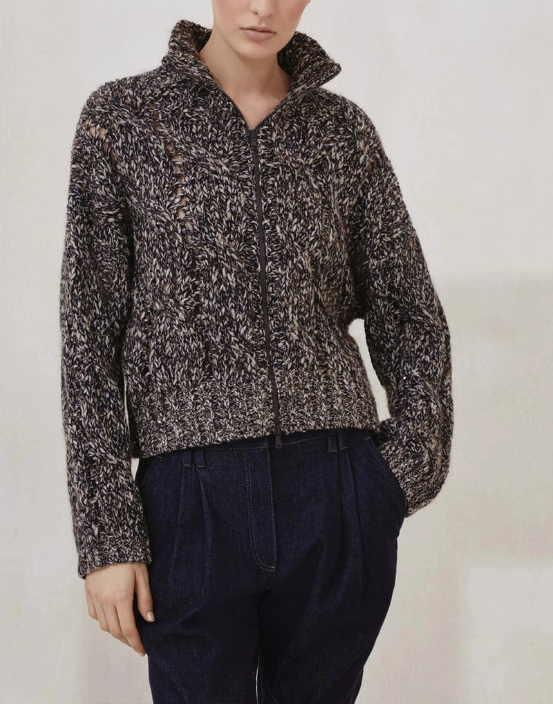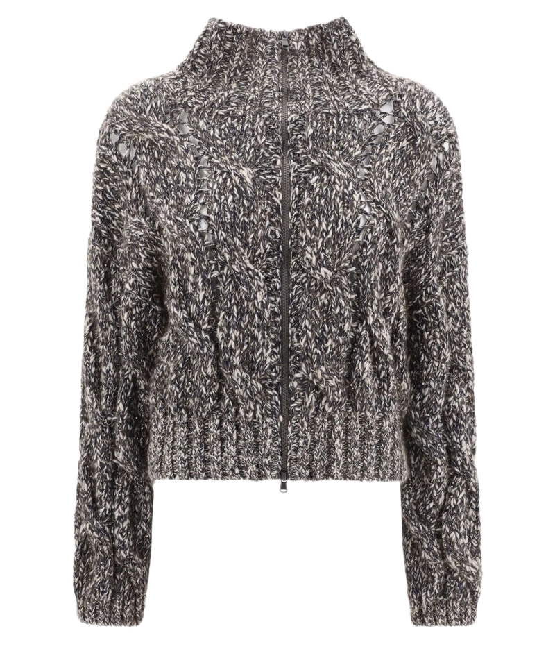 Симфония утонченного мастерства и роскошных материалов, кардиган chiné с косами от Brunello Cucinelli является воплощением вечной элегантности. Изготовленный из мягкой смеси шерсти, кашемира и мохера, этот кардиган отличается классическим узором в виде кос, смягченным уникальной структурой его пряжи. Техника chiné, достигаемая переплетением волокон разных оттенков, придает изысканную игру цвета, создавая глубину и изящное ощущение движения по всей поверхности. Вшитые пайеточные нити добавляют нотку утонченного блеска, гармонируя с врожденной женственностью кардигана. Благодаря слегка укороченному силуэту, широким рукавам и заниженной линии плеч, эта вещь воплощает идеальное сочетание современного стиля и неизменной грации, демонстрируя непревзойденную преданность Brunello Cucinelli роскошному трикотажу.