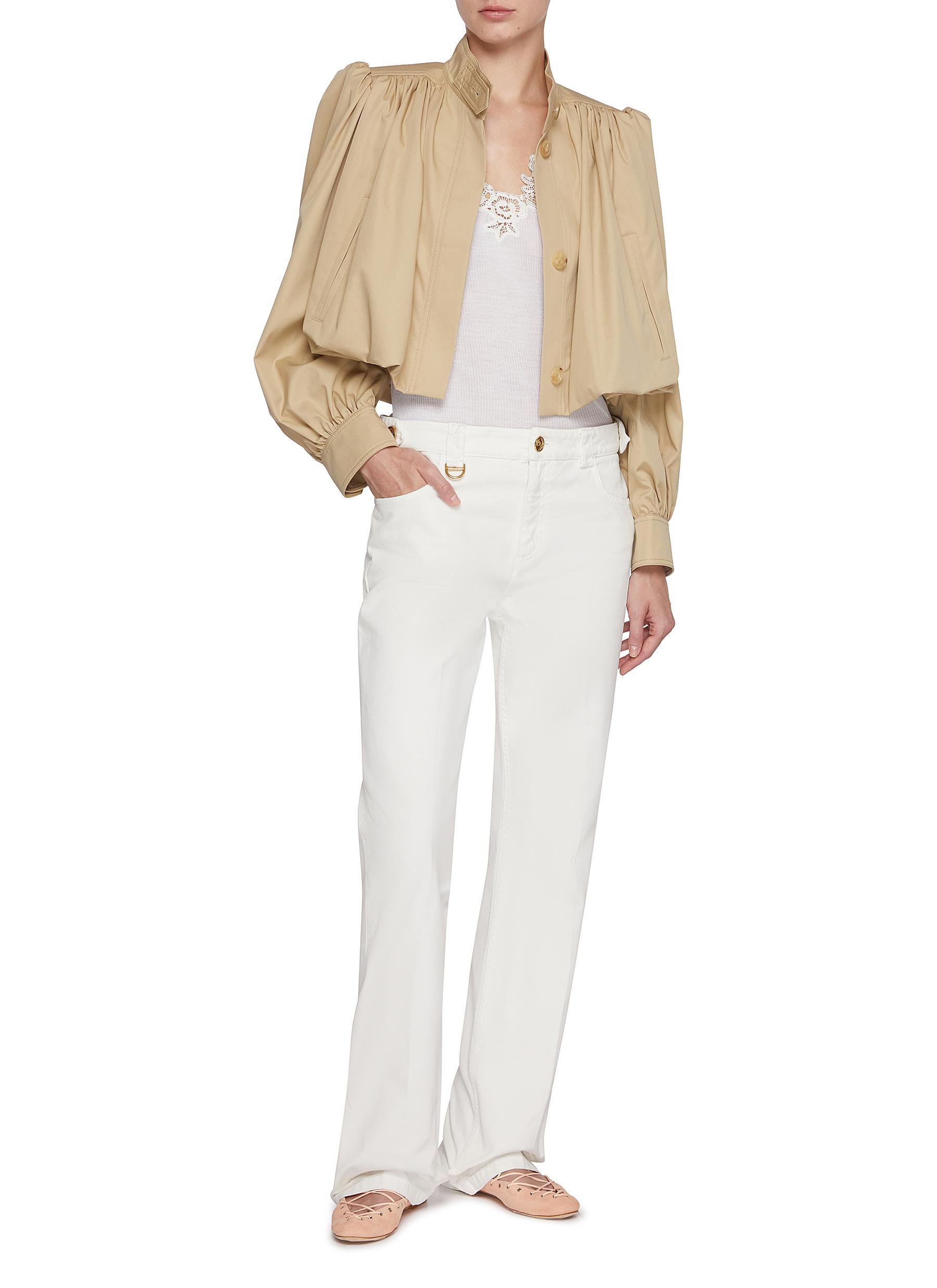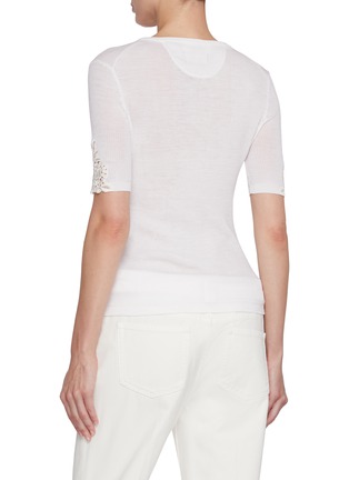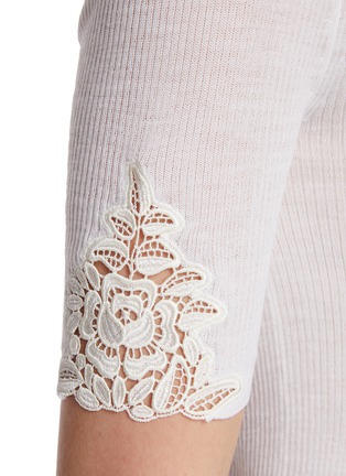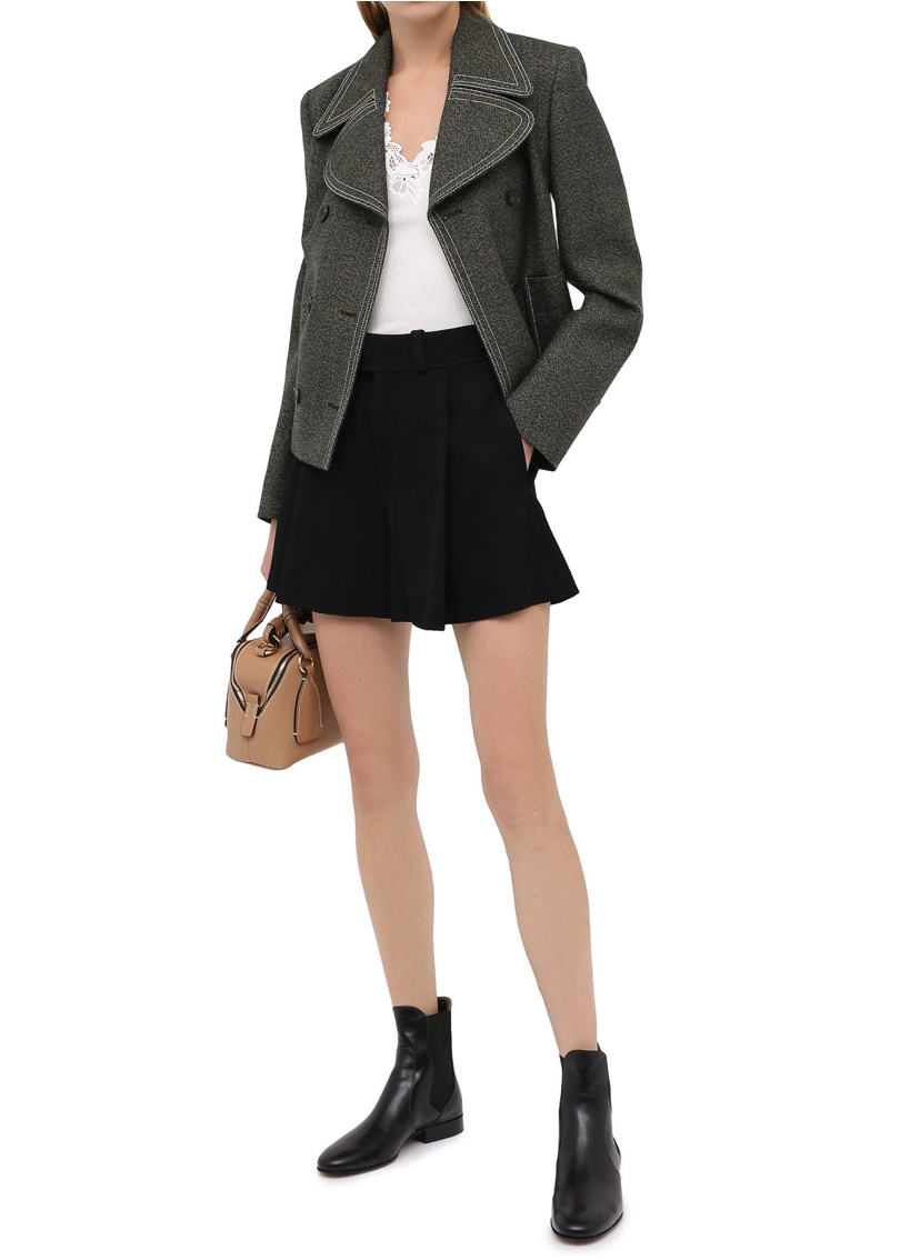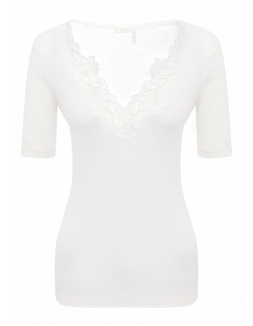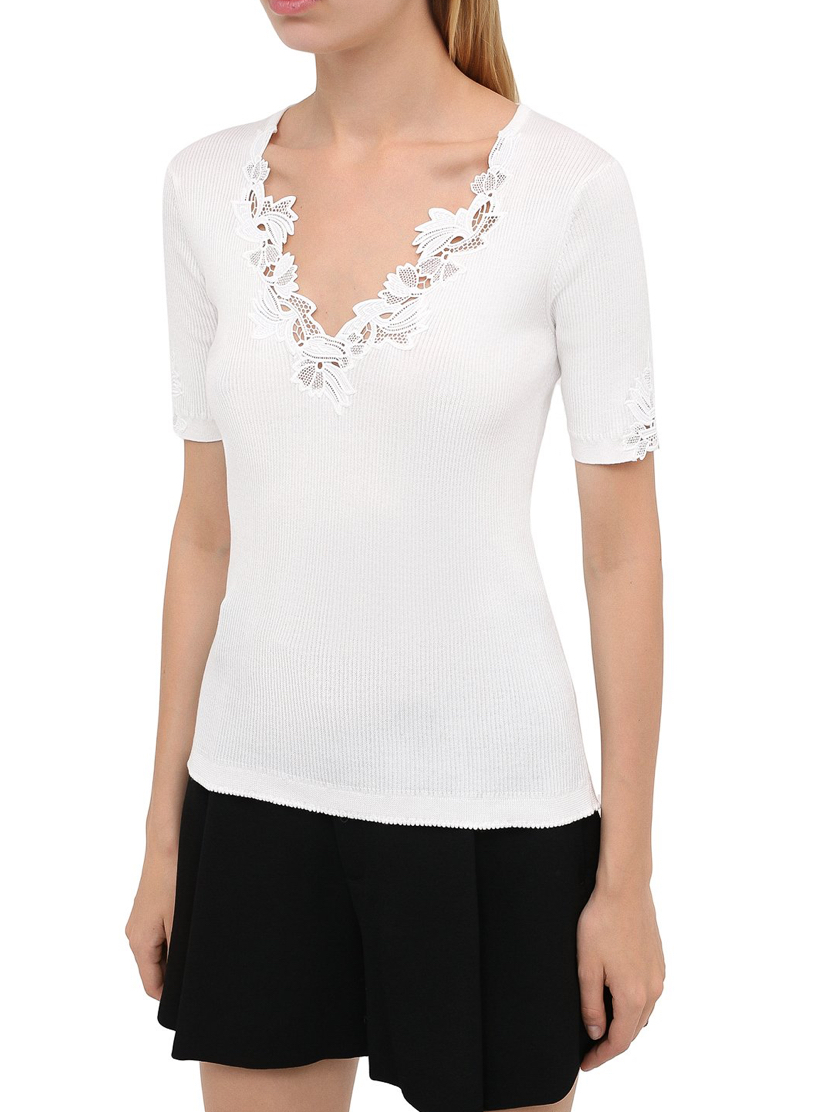 Для изготовления белого облегающего топа из осенне-зимней коллекции Наташа Рамсей-Леви выбрала тонкий легкий хлопок с фактурной поверхностью в узкий рубчик. Материал хорошо пропускает воздух и впитывает влагу, поддерживая состояние комфорта в течение дня. Цветочное кружево на коротких рукавах и V-образной горловине делает изделие женственнее.