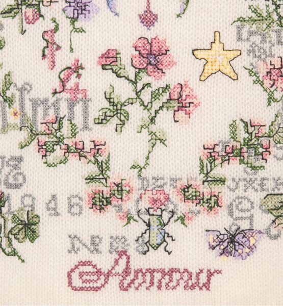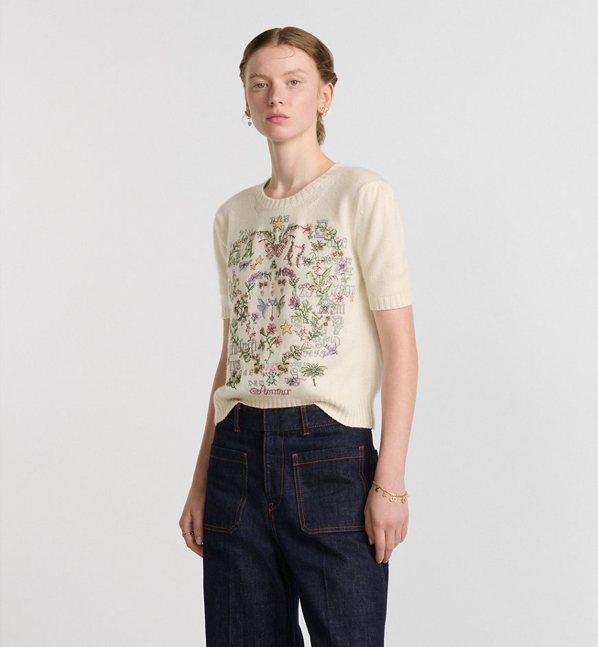 Джемпер с коротким рукавом из капсульной коллекции Dioramour, отражающей взгляд Dior на любовь и романтику, украшен созданным Пьетро Руффо вышитым многоцветным мотивом Amour1947. Узор с изображением поэтичного сердца, дополненного символами модного дома и излюбленными элементами господина Диора, отличается имитацией вышивки крестом, которая придает дизайну звучание в стиле ретро. Модель стандартного кроя с отделкой в рубчик выполнена из кашемирового трикотажа цвета экрю. Свитер можно сочетать с другими изделиями из коллекции Dioramour для создания эффектных образов в любом сезоне.