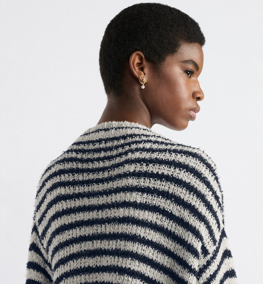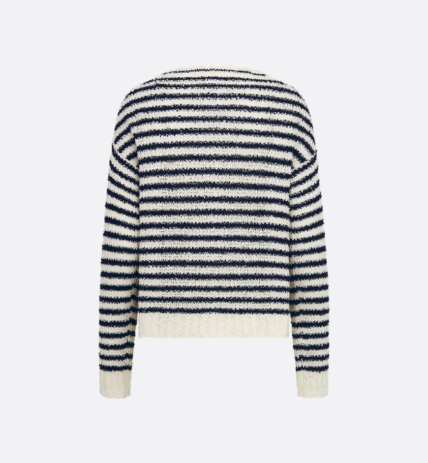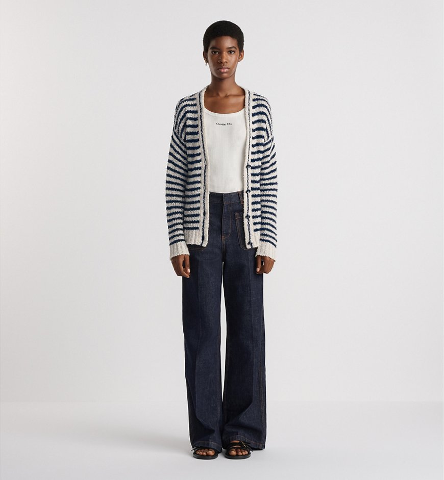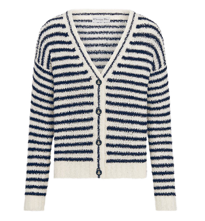 Этот кардиган – вневременной и современный фасон. Он выполнен из хлопково-шелкового трикотажа с бело-темно-синим мотивом Dior Marinière, имеет классический крой и украшен пуговицами в виде якоря. Кардиган добавит изысканности непринужденному образу.