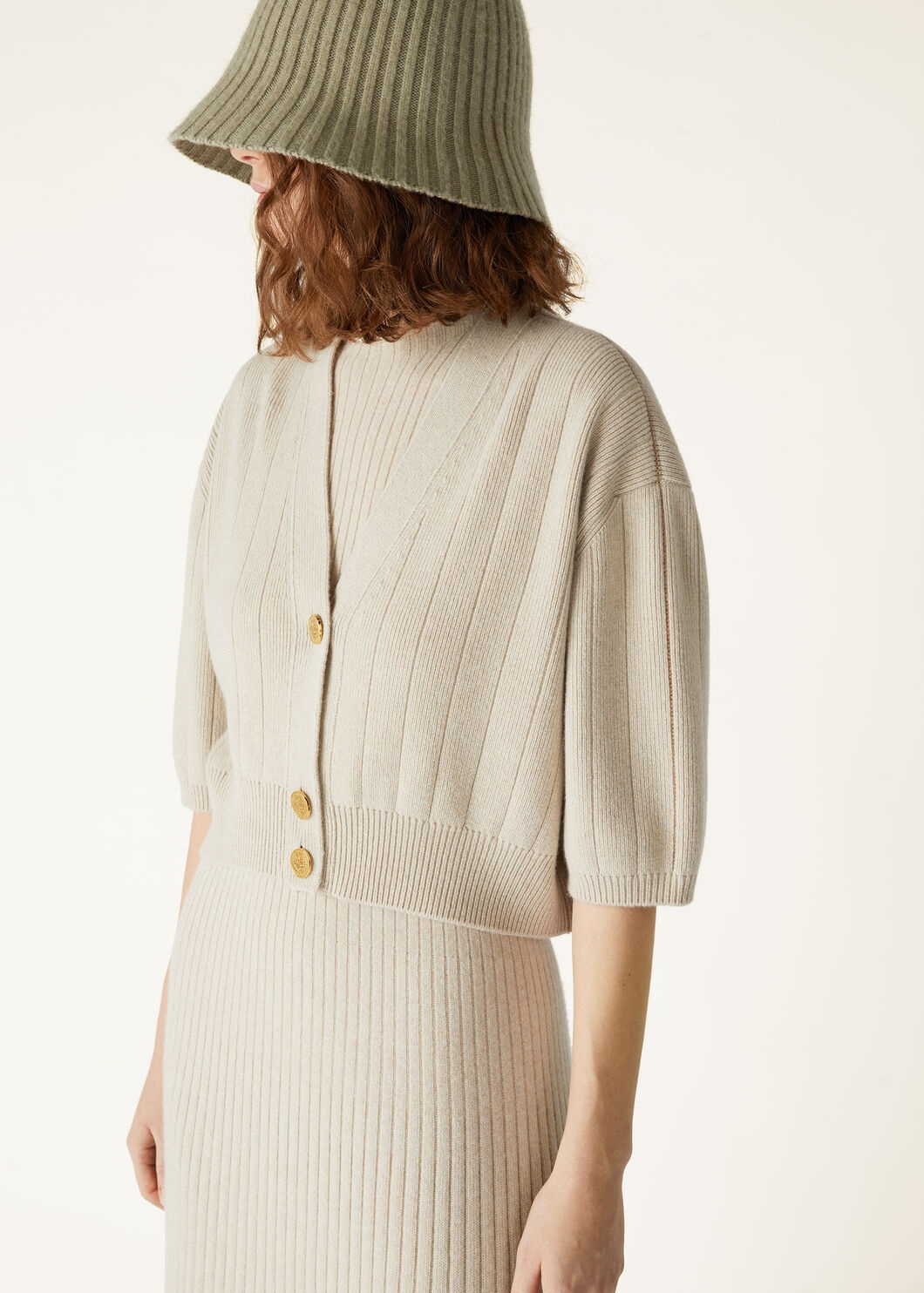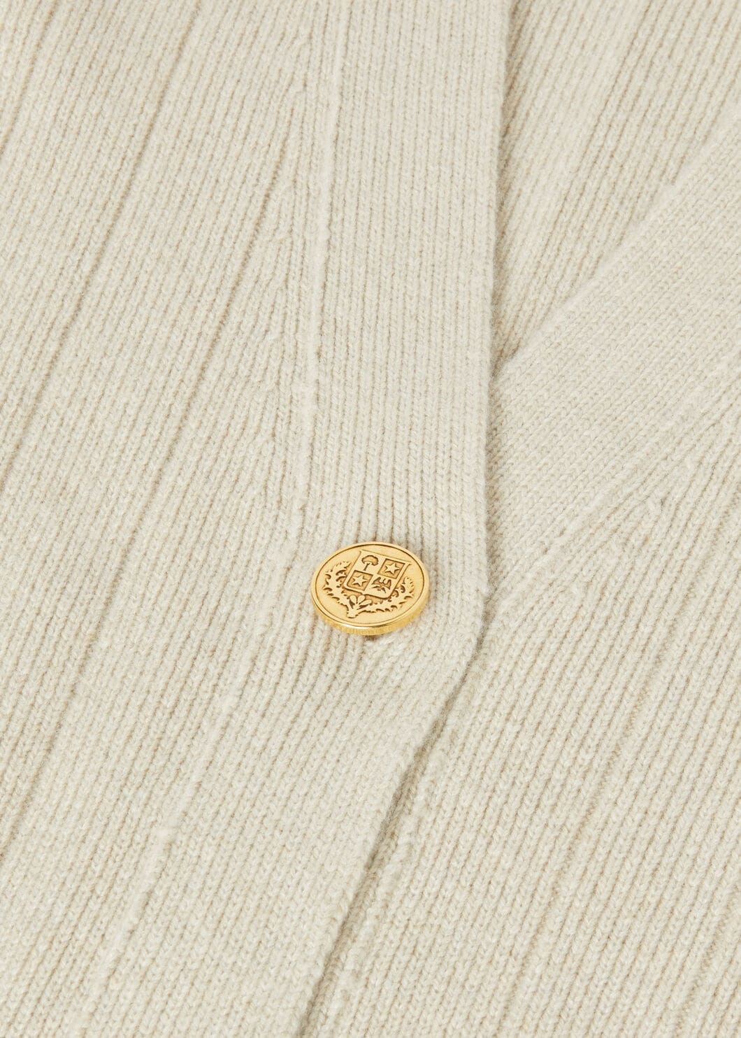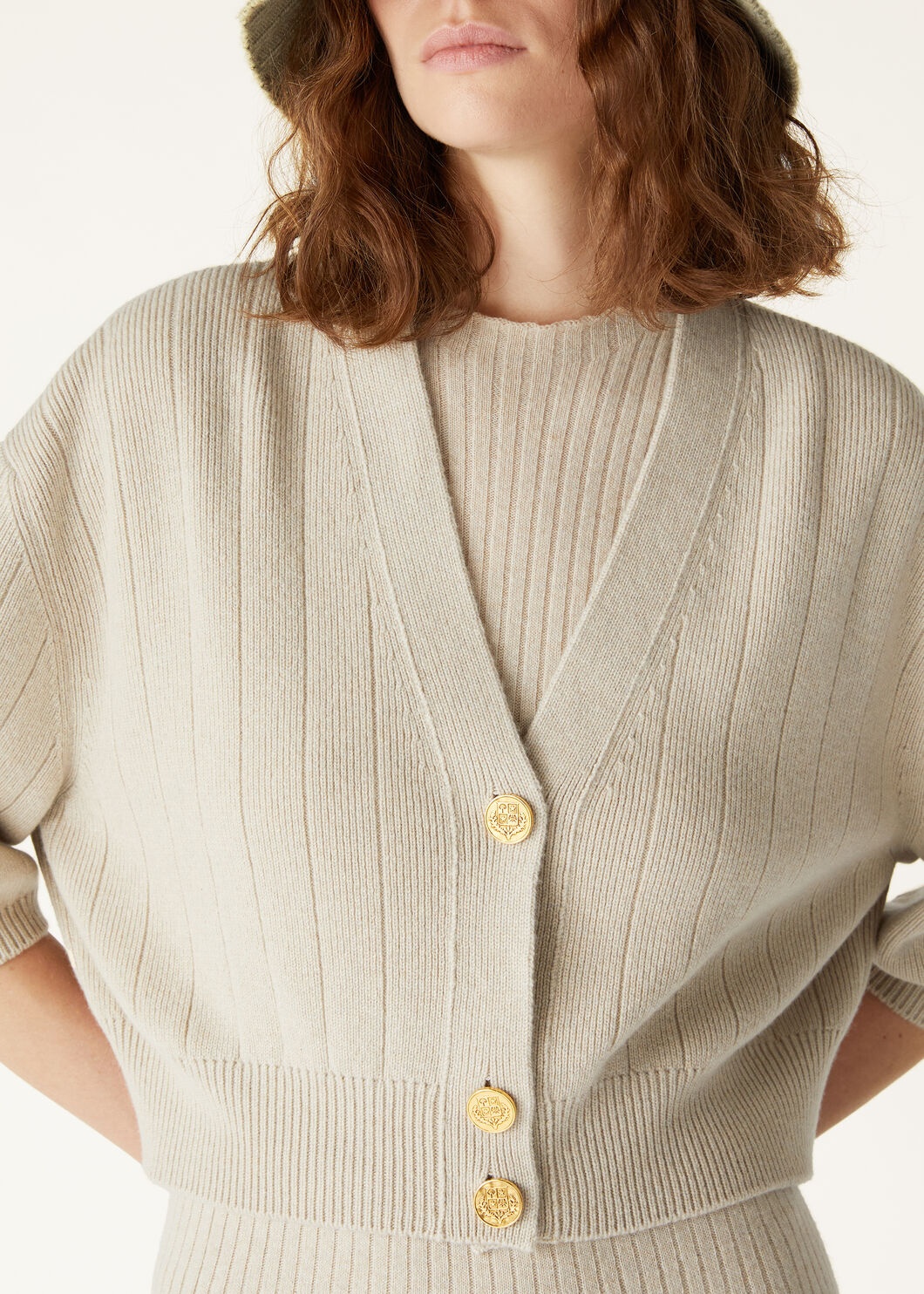 В нежном танце мягкости и прочности кардиган Cervatto сочетает в себе лучшие материалы с изысканным мастерством. Пряжа из детского кашемира окутывает вас роскошным теплом, подчеркнутым контрастной вышивкой на плечах и проймах, создавая причудливый вид. Мягко скроенный силуэт с слегка приспущенными рукавами и плечами облегает вашу фигуру, а три золотистые металлические пуговицы придают изысканный штрих. Подробности об изделии Ребристый дизайн Ребристые манжеты и подол Планка гладкой вязки Застегивается на три пуговицы в виде монет из золотистого металла с гравировкой в виде герба Состав: 100% детский кашемир