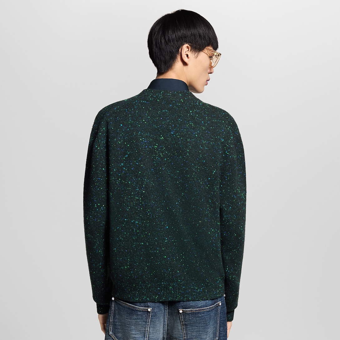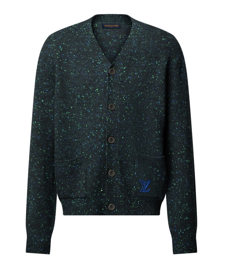 Этот мягкий кашемировый кардиган связан в насыщенном лесном зеленом цвете с крапчатыми синими, зелеными и красными акцентами. На левом кармане он украшен контрастной синей надписью LV, вышитой в стиле «hand-made», отсылающей к истории японского мастерства, воплощенной в коллаборации Фаррелла и Ниго в этом сезоне. Этот легкий и роскошный слой можно носить в любое время года.