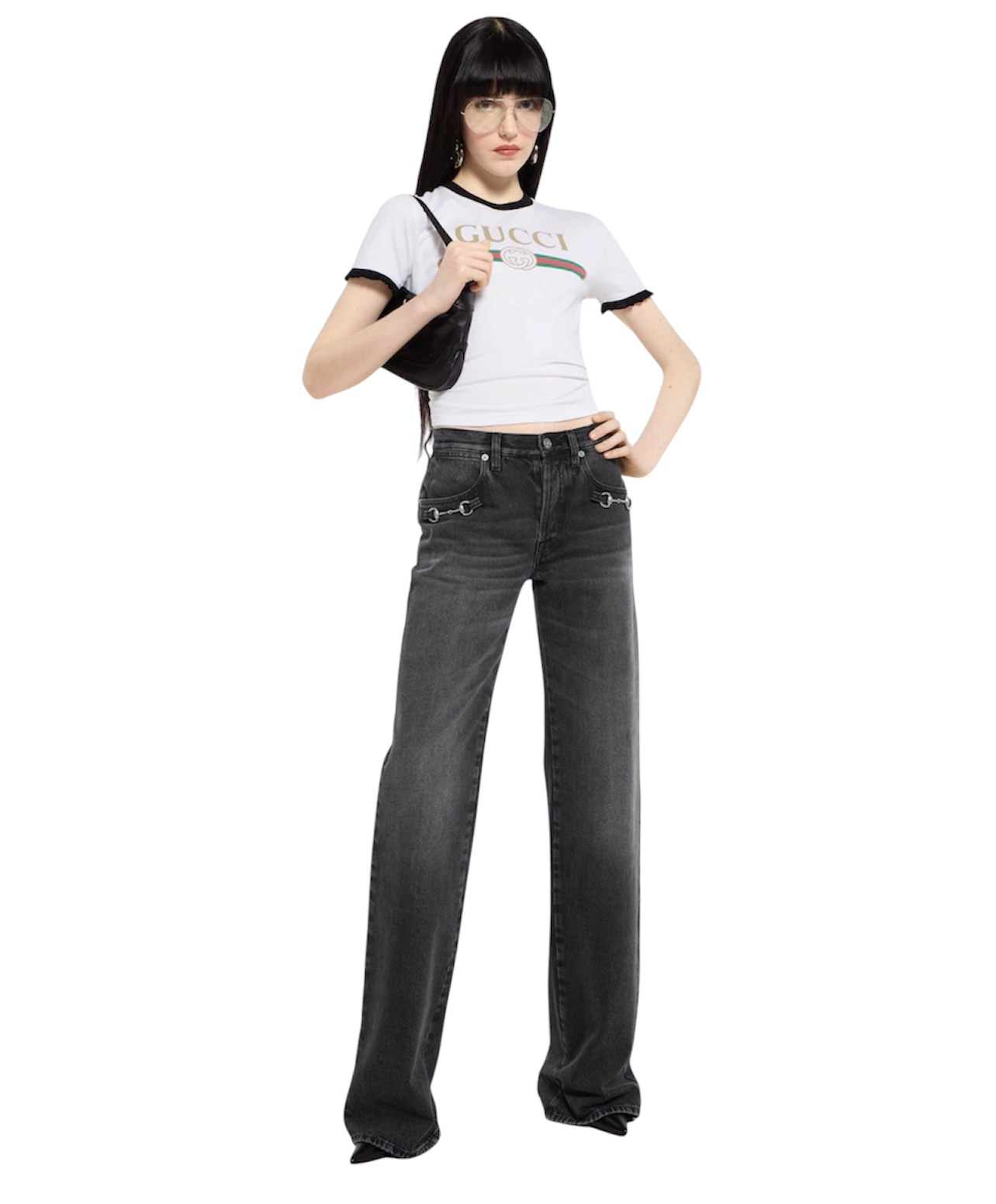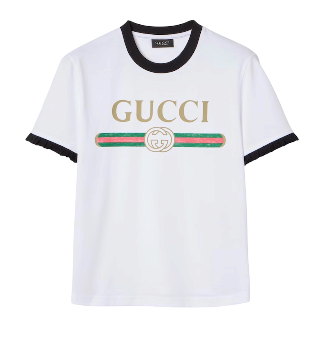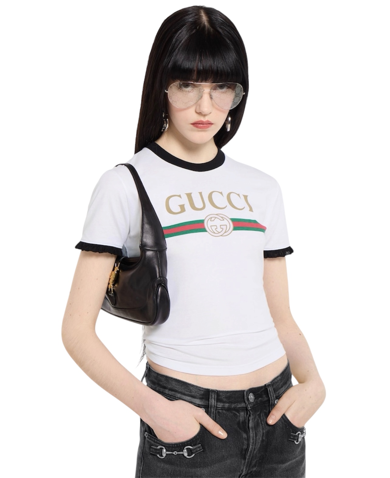Представляем коллекцию Весна-Лето 2026. Эта модель входит в коллекцию La Famiglia, которая переосмысливает коды Дома, отражая индивидуальность и отличительные эстетические взгляды. Футболка, изготовленная из хлопкового трикотажа, украшена принтом Gucci Web с переплетающимися буквами G.