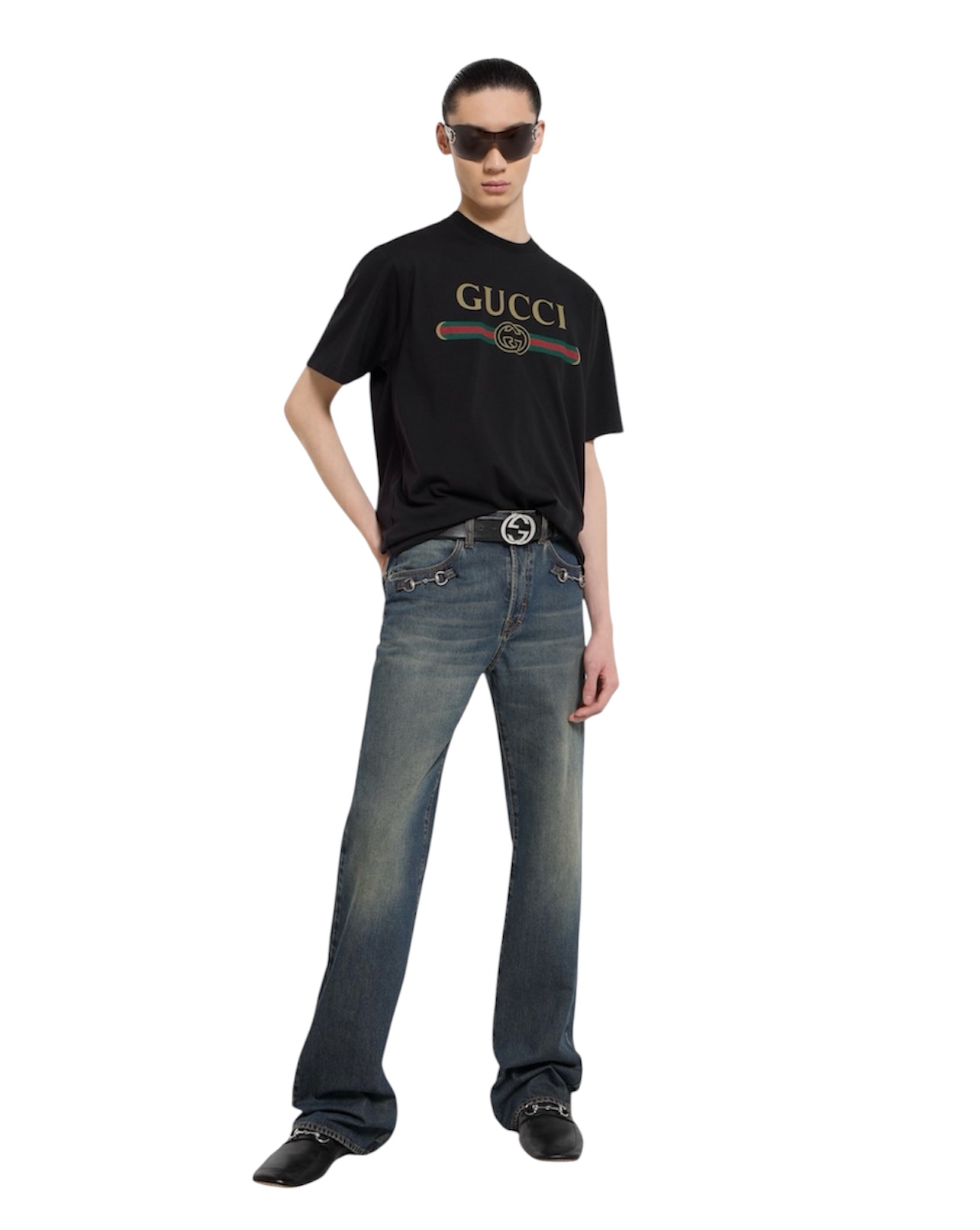 Представляем коллекцию Весна-Лето 2026. Этот стиль вдохновлен образом «ботаника» La Famiglia. Коллекция переосмысливает коды Дома, отражая индивидуальные черты и отличительные эстетические взгляды. Эта футболка, изготовленная из смесового шелкового трикотажа, украшена принтом Gucci Web с переплетающимися буквами G.