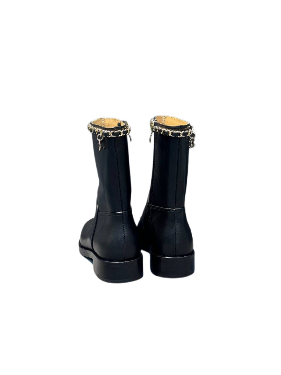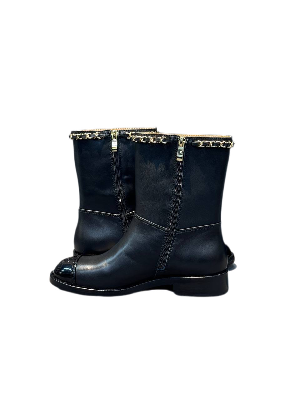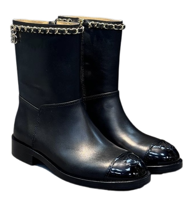 БотинкиПри выборе обуви следует обращать внимание на качество, удобство и, конечно, одинаковый внешний вид.Эти ботинки из новой коллекции Шанель выполнены из кожи со вставками и дополнены цепью. Эта пара обуви выполнена в классическом черном цвете, а это значит, что ее можно комбинировать с максимальным количеством образов.