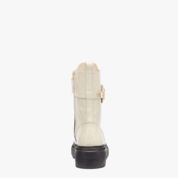 Байкерские ботинки скруглым носком, шнуровкой иремешком снадписью Fendi. Модель из кожи белого цвета. Металлическая фурнитура сзолотистым покрытием.