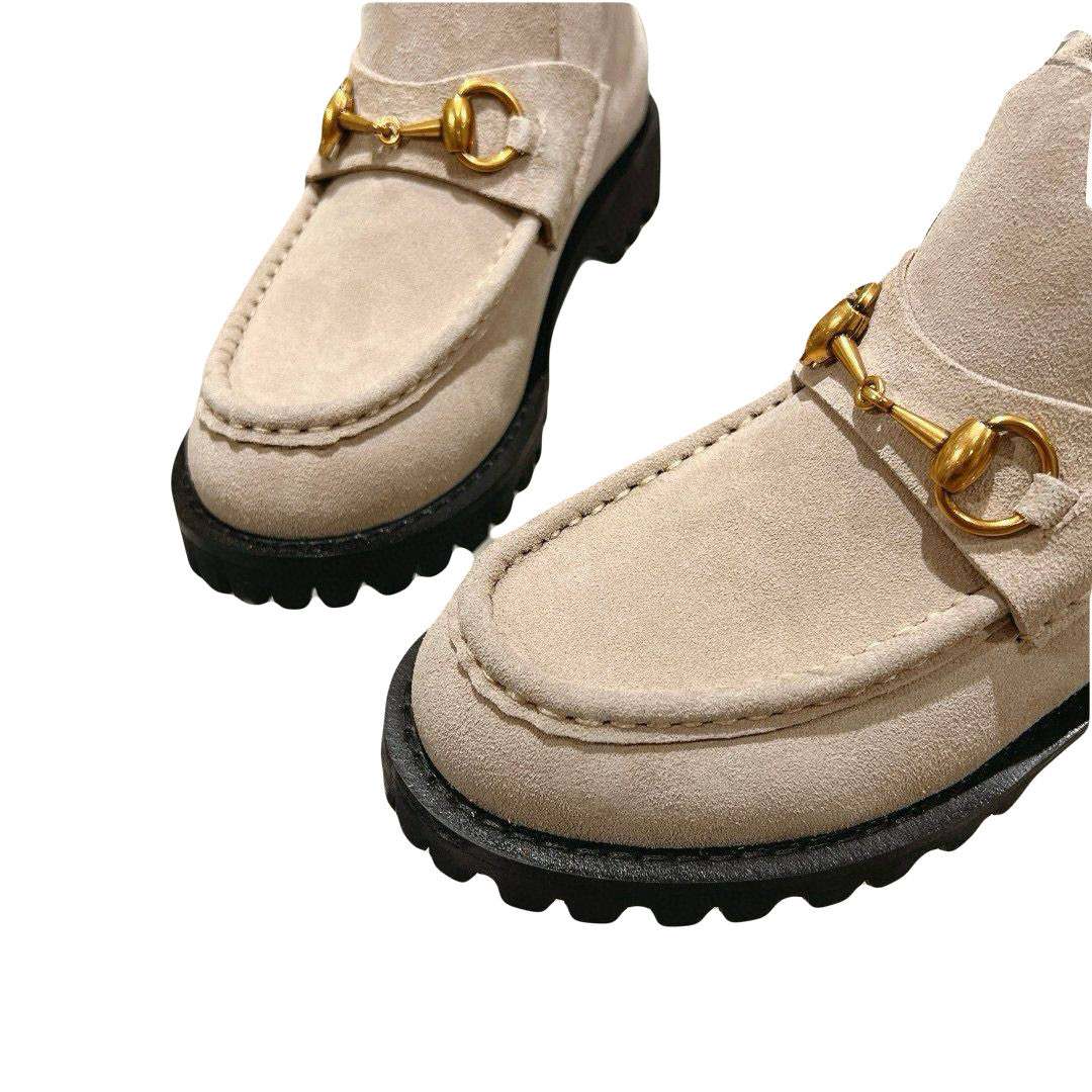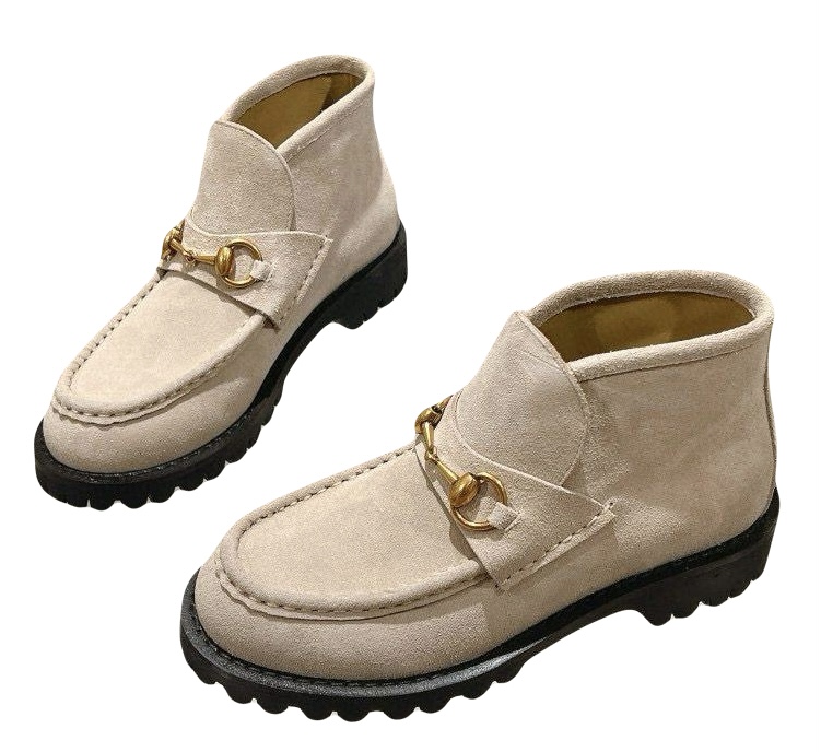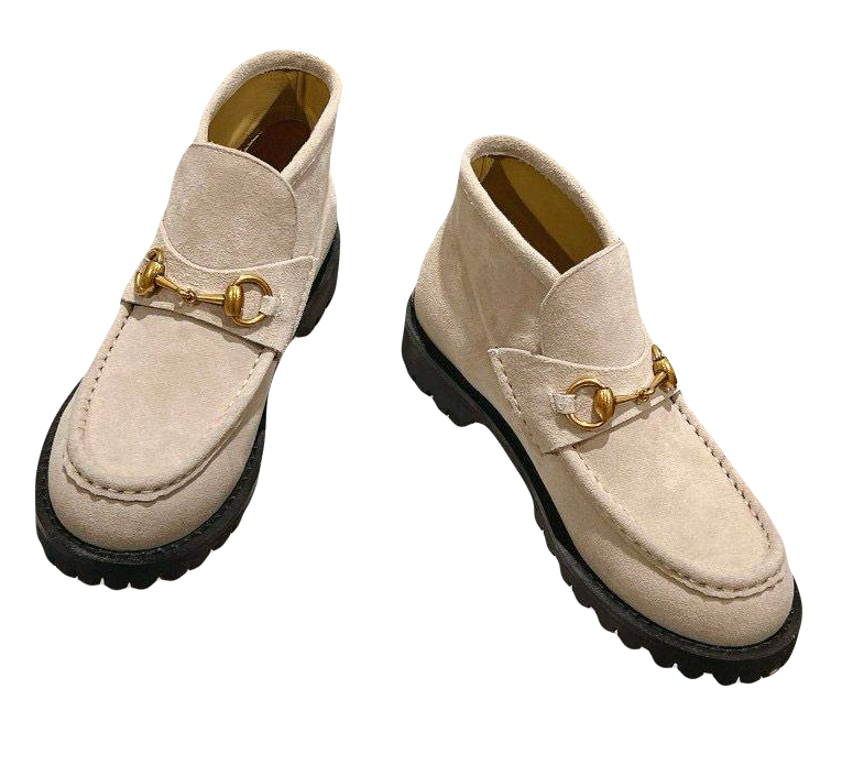 В женской коллекции осень-зима 2024/25 базовые модели дополнены узнаваемыми деталями. Эти ботинки из белойзамши дополнены фирменной деталью Horsebit золотистогоцвета. Рифленая подошва из каучука дополняет дизайн.
