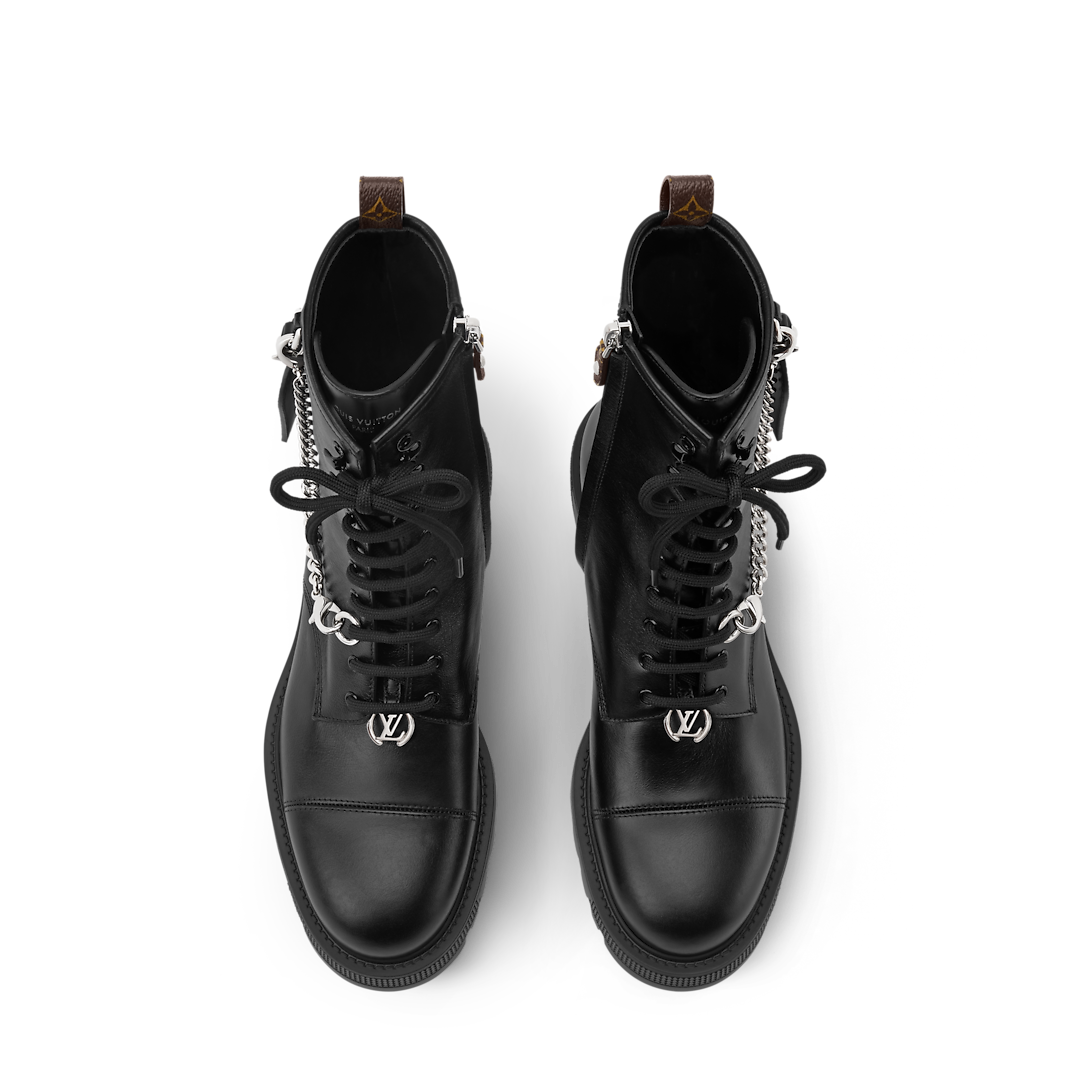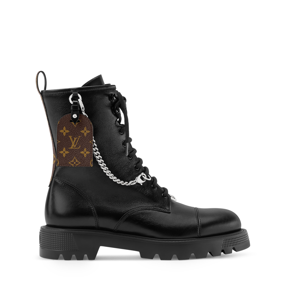 Ботинки District Ranger выполнены в стиле милитари из мягкой телячьей кожи. Верх украшен цепочкой из серебристого металла и багажной биркой из канвы Monogram, отсылающей к истории бренда, связанной с путешествиями. Эти ботильоны дополнены массивной, но легкой подошвой из ЭВА с выраженным протектором.