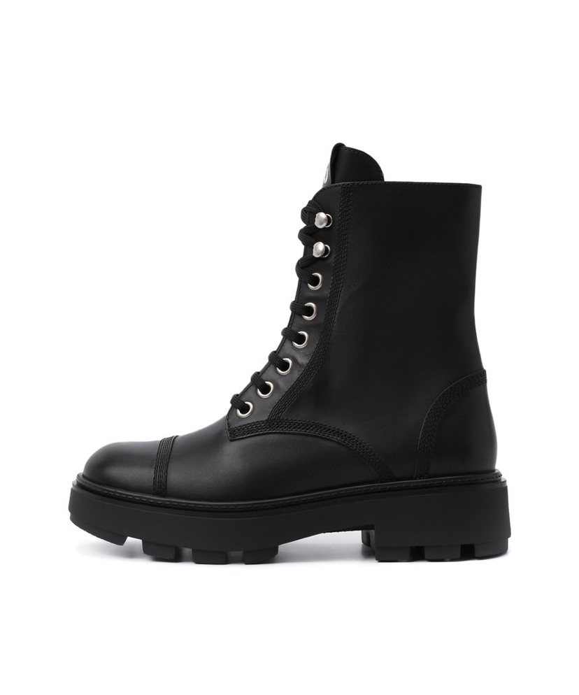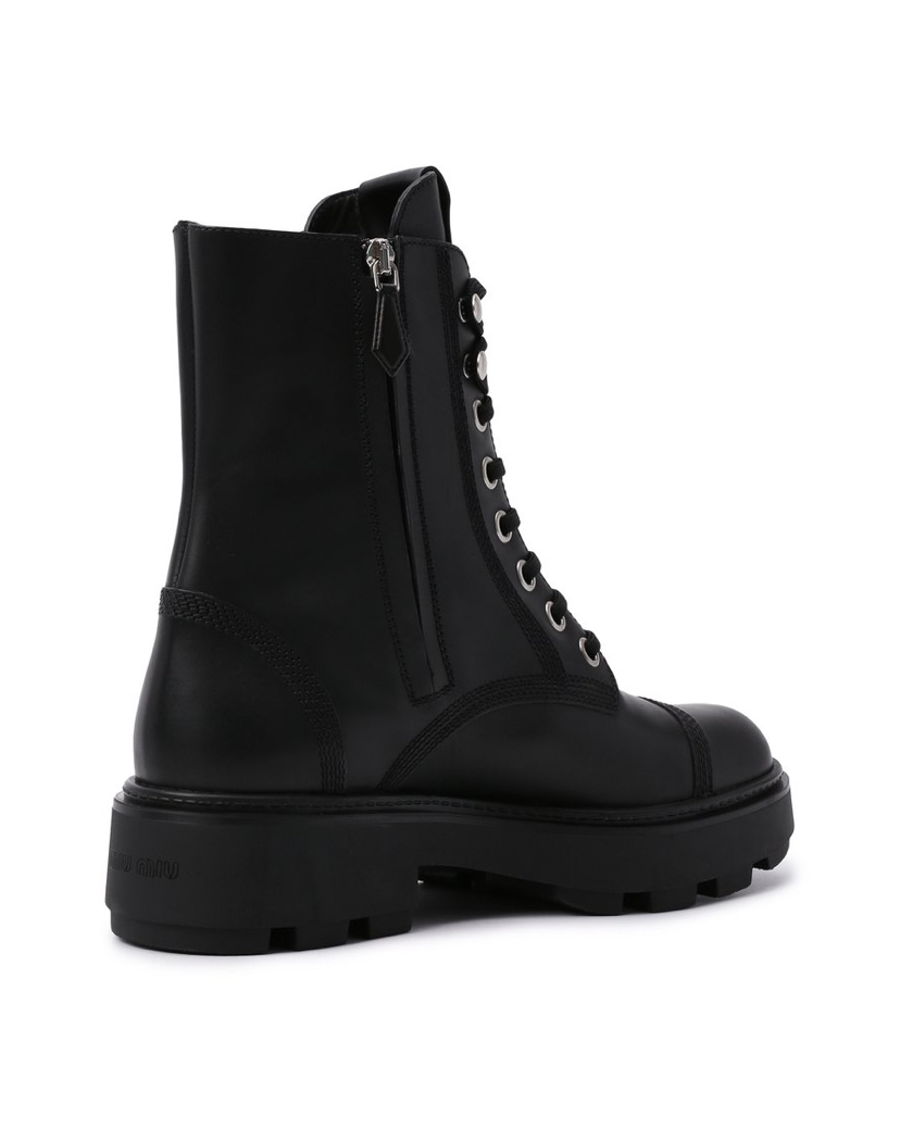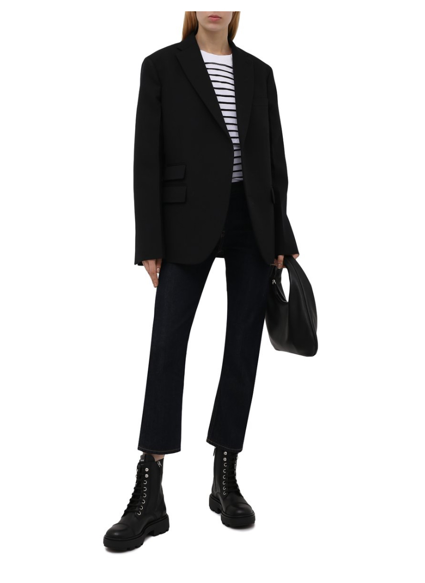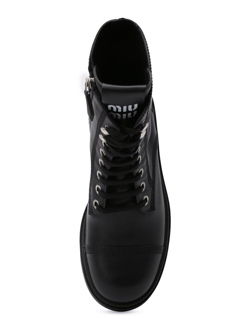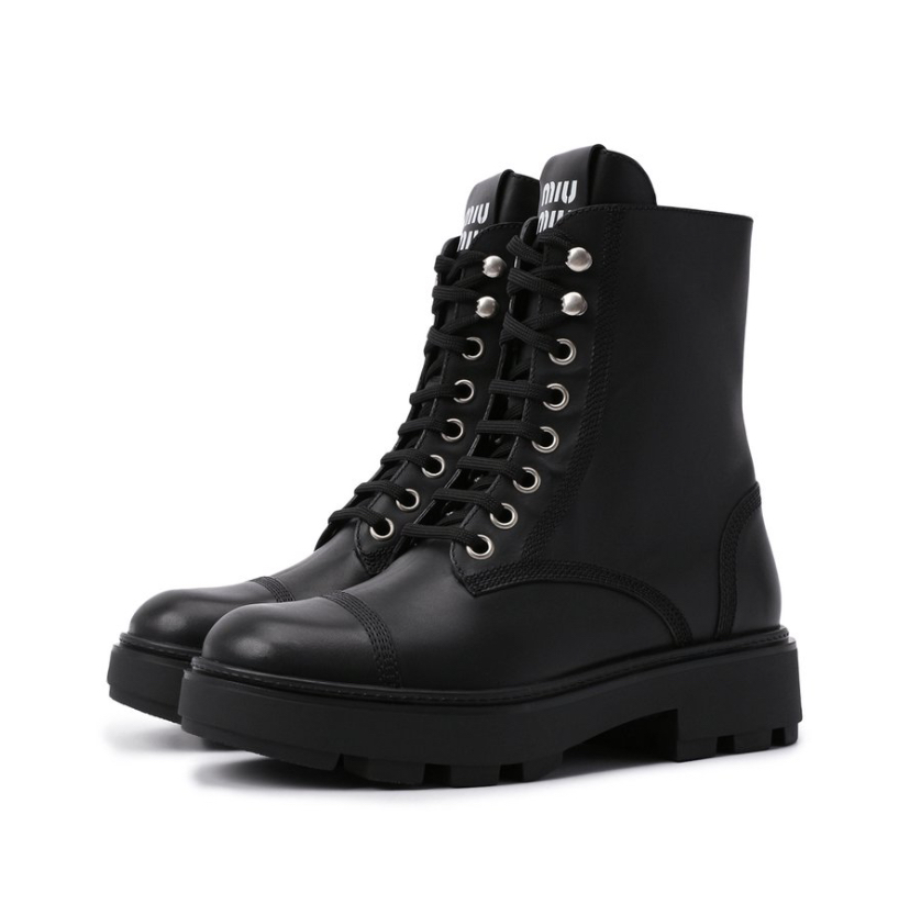 Высокие черные ботинки, вдохновленные байкерской обувью, добавят маскулинности повседневному образу. Для пошива модели из осенне-зимней коллекции Миучча Прада выбрала гладкую матовую кожу, устойчивую к заломам. Язычок декорировали контрастным белым логотипом. Широкая подошва с глубоким протектором обеспечивает дополнительную защиту от луж и помогает меньше скользить на обледенелой и мокрой дороге.