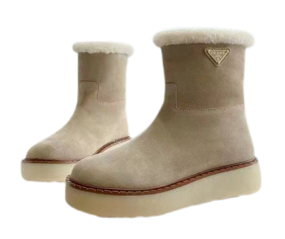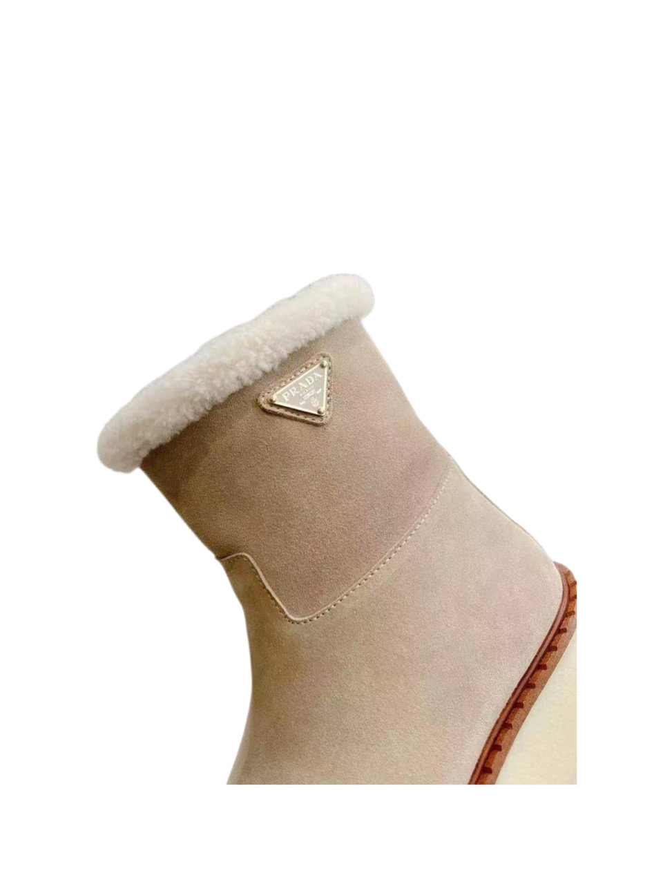 Ботильоны Prada изготовлены из замши и дополнены подкладкой из овчины. Пара дополнена узнаваемым треугольным логотипом.