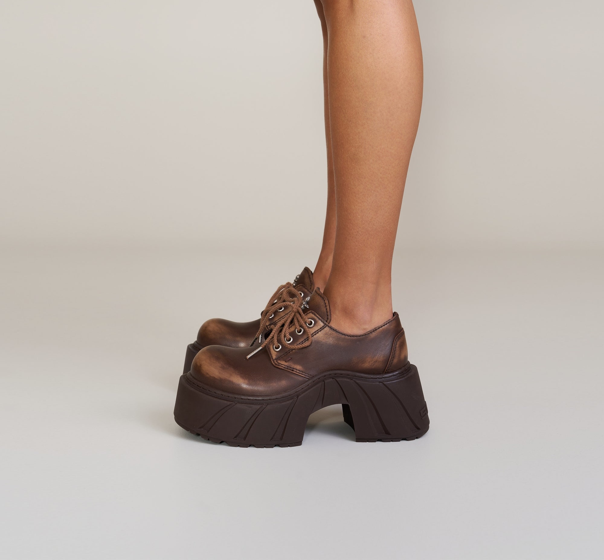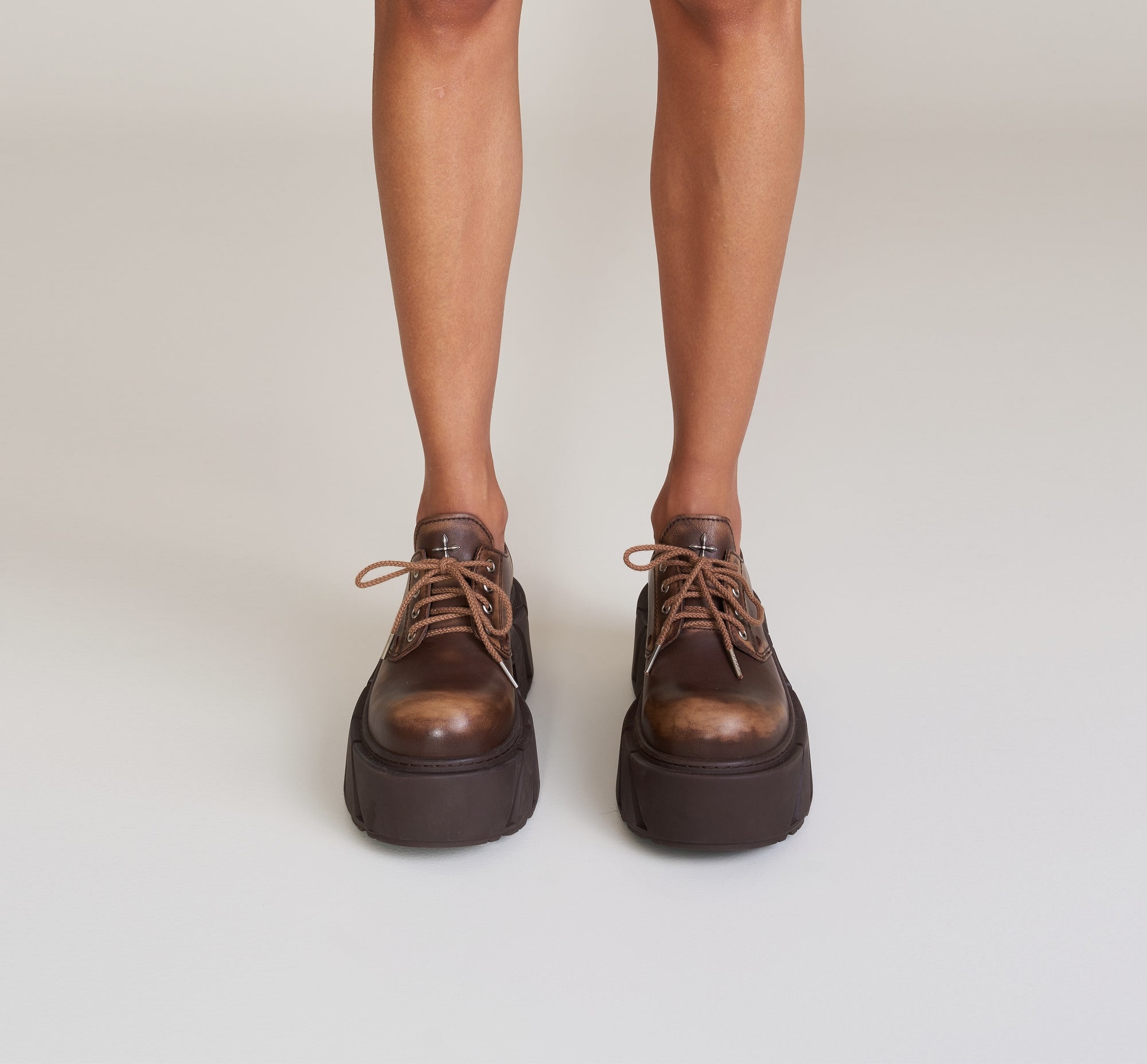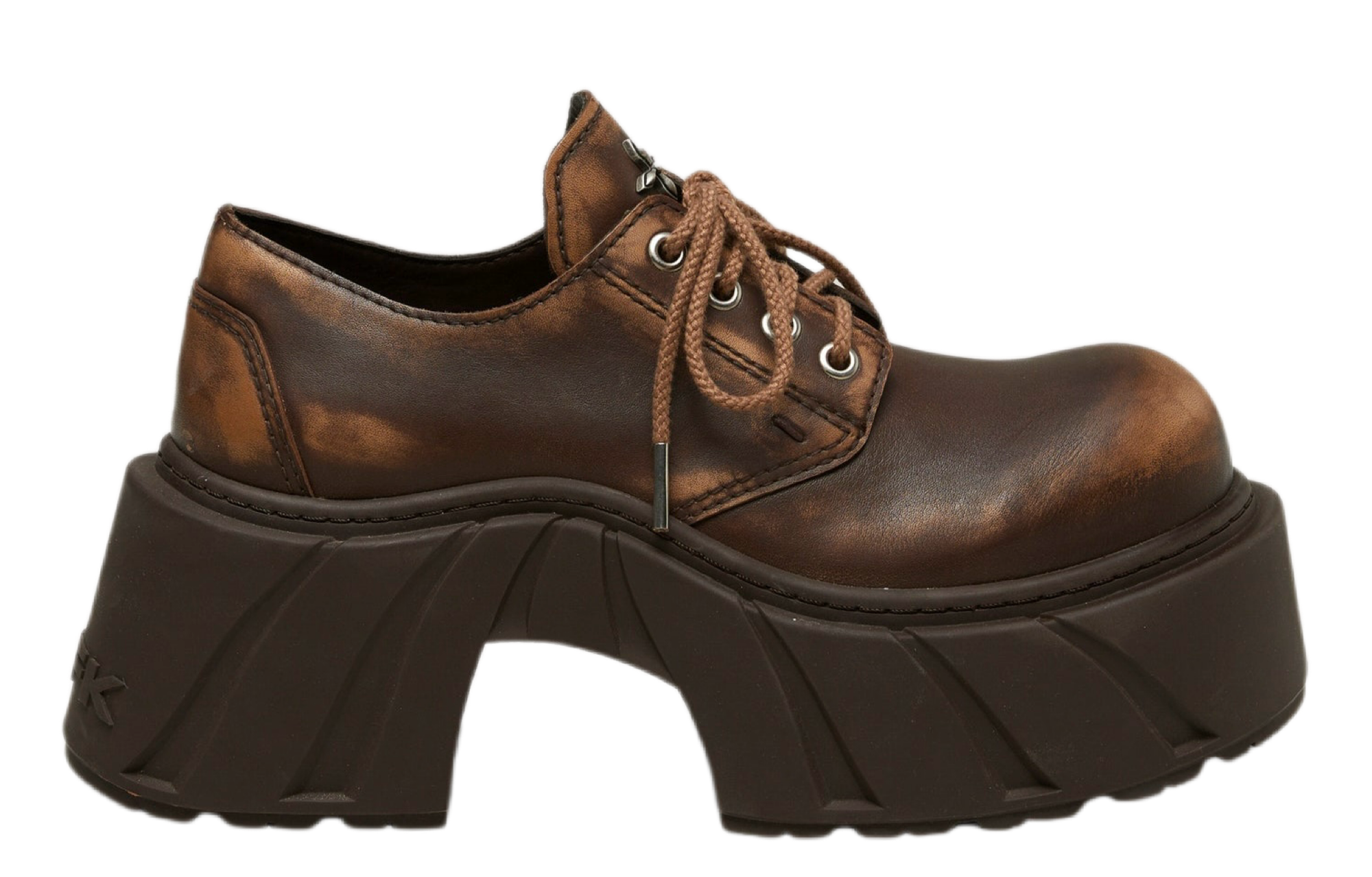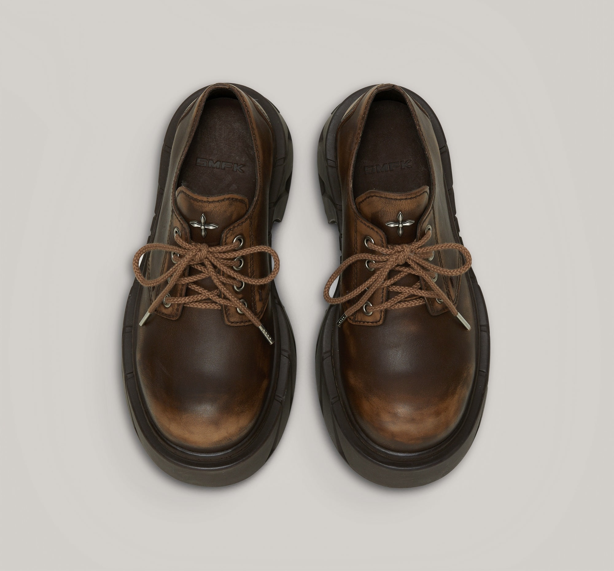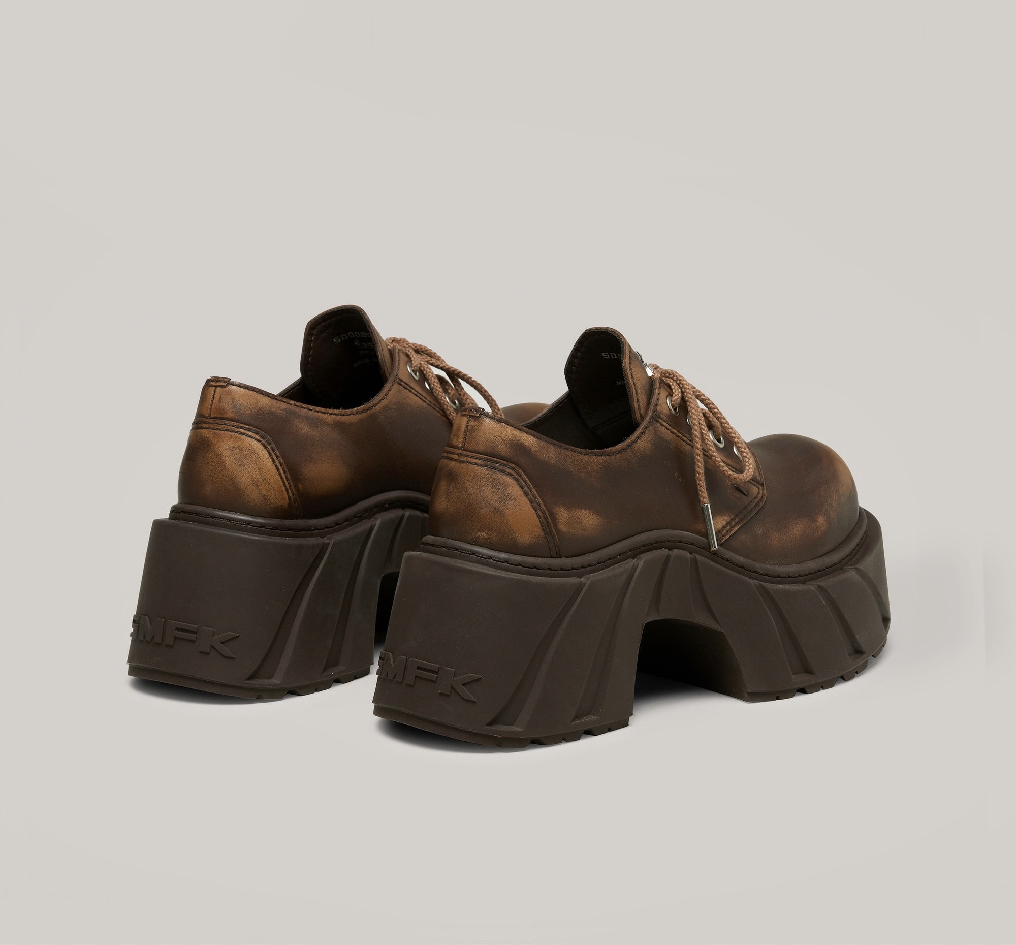Mirage – это серия обуви и ботинок, разработанная SMFK в 2025 году. Культовый стиль обуви SMFK, туфли дерби на высоком каблуке, использует новую структуру срезанного угла дерби с резиновой комбинированной подошвой.