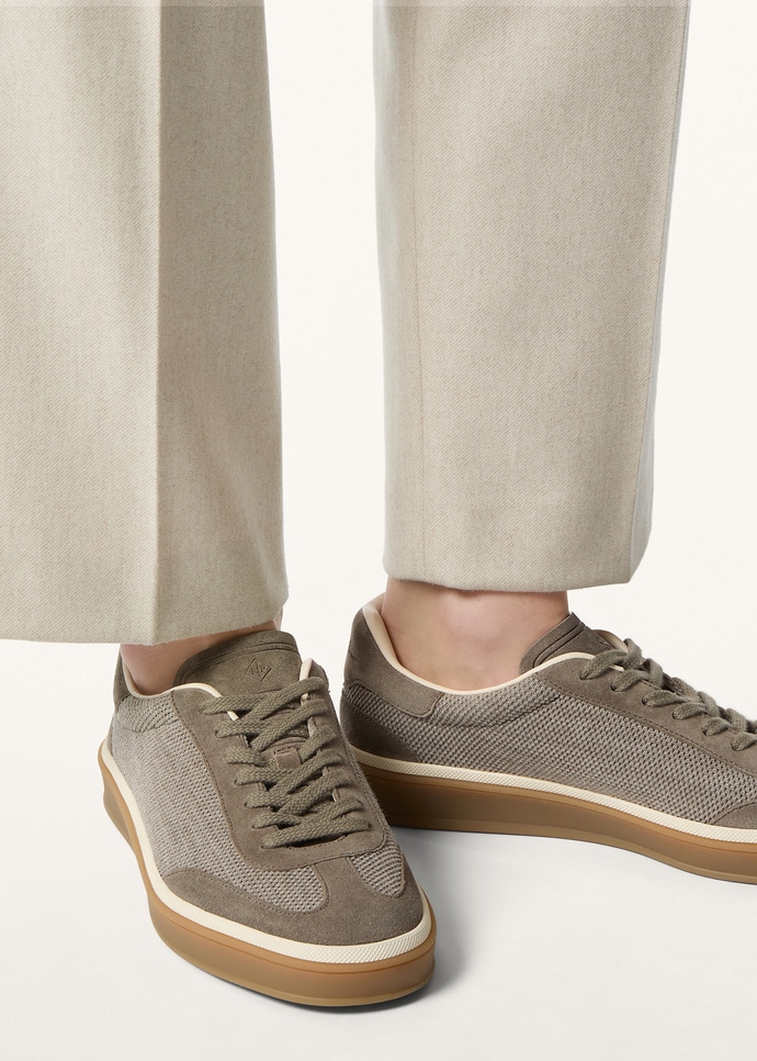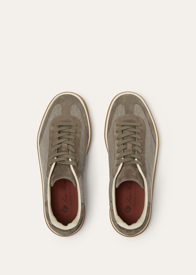 Кроссовки Tennis Walk, напоминающие по удобству винтажные туфли для яхтинга, остаются актуальными из сезона в сезон. Они изготовлены из эксклюзивной ткани Pecora Nera®, полученной из драгоценной неокрашенной шерсти темноокрашенных мериносовых овец. Приятные на ощупь замшевые вставки подчеркивают дизайн, придавая ему элегантность. Завершает образ белая основа, обрамленная карамельной подошвой, создающей иллюзию двойного слоя.