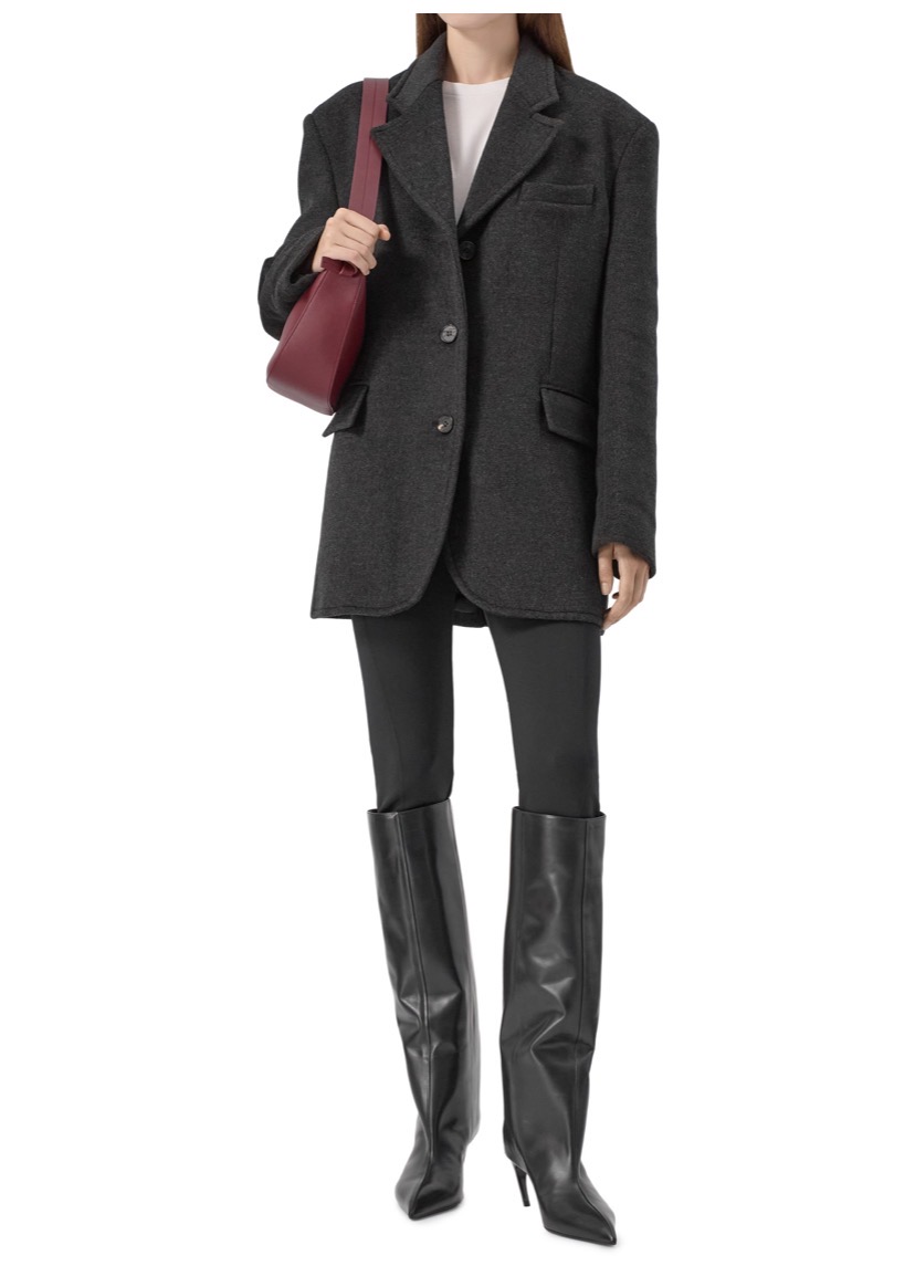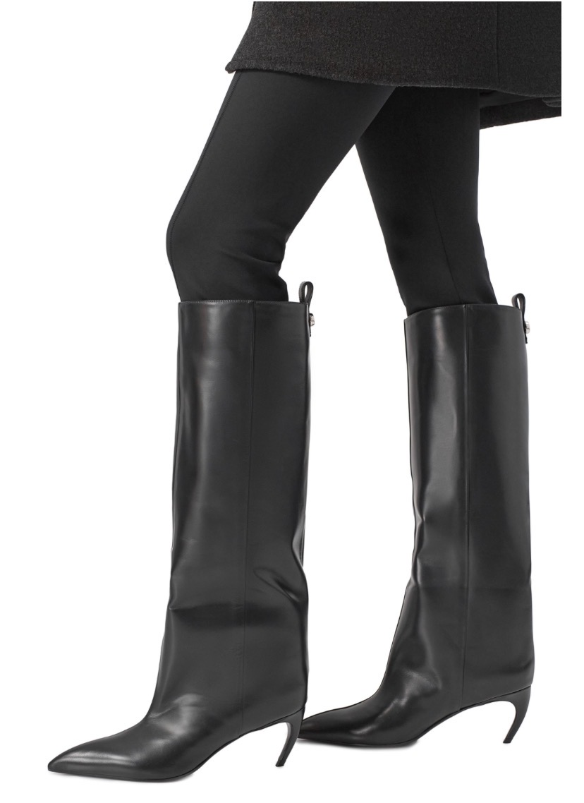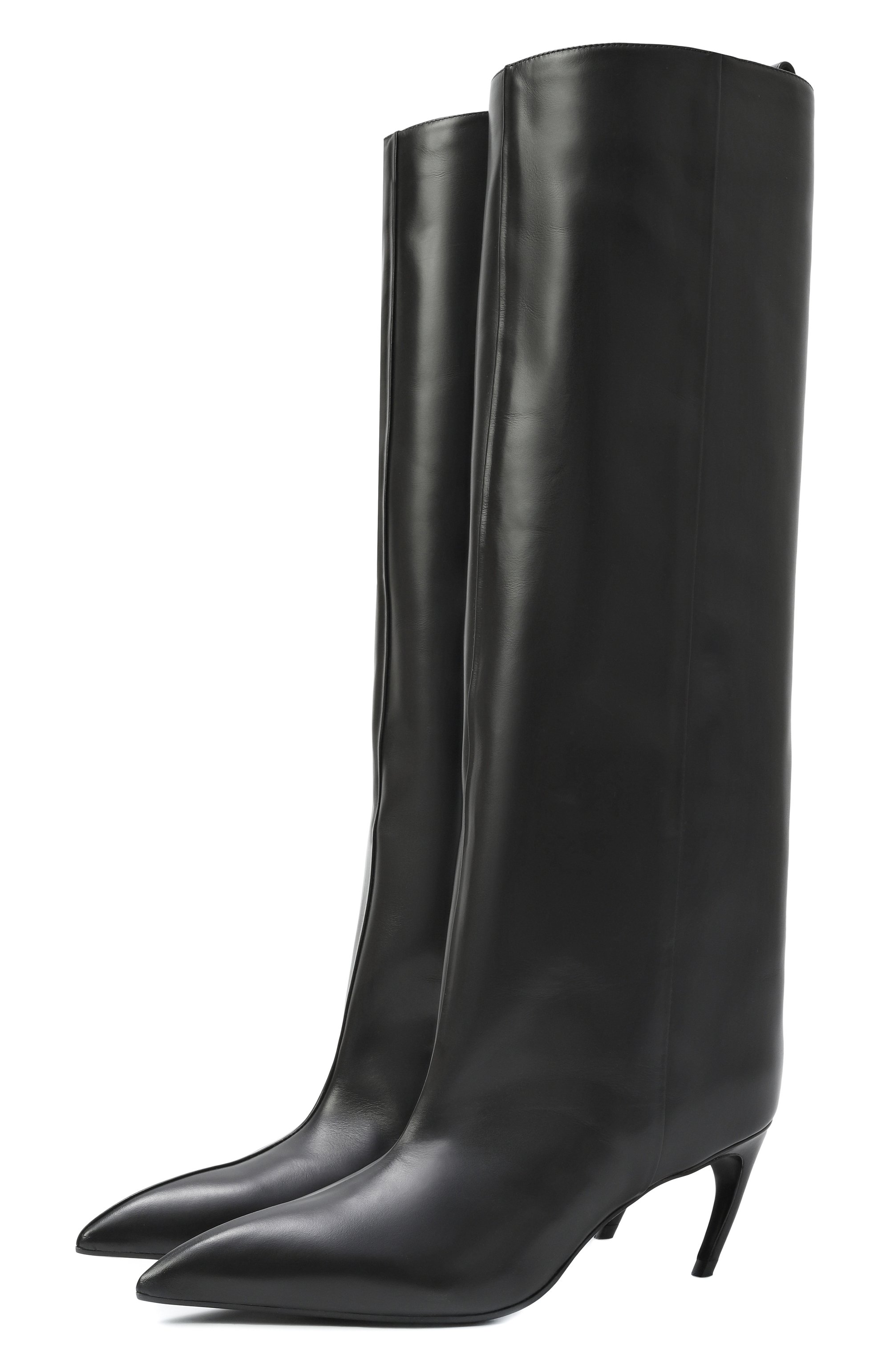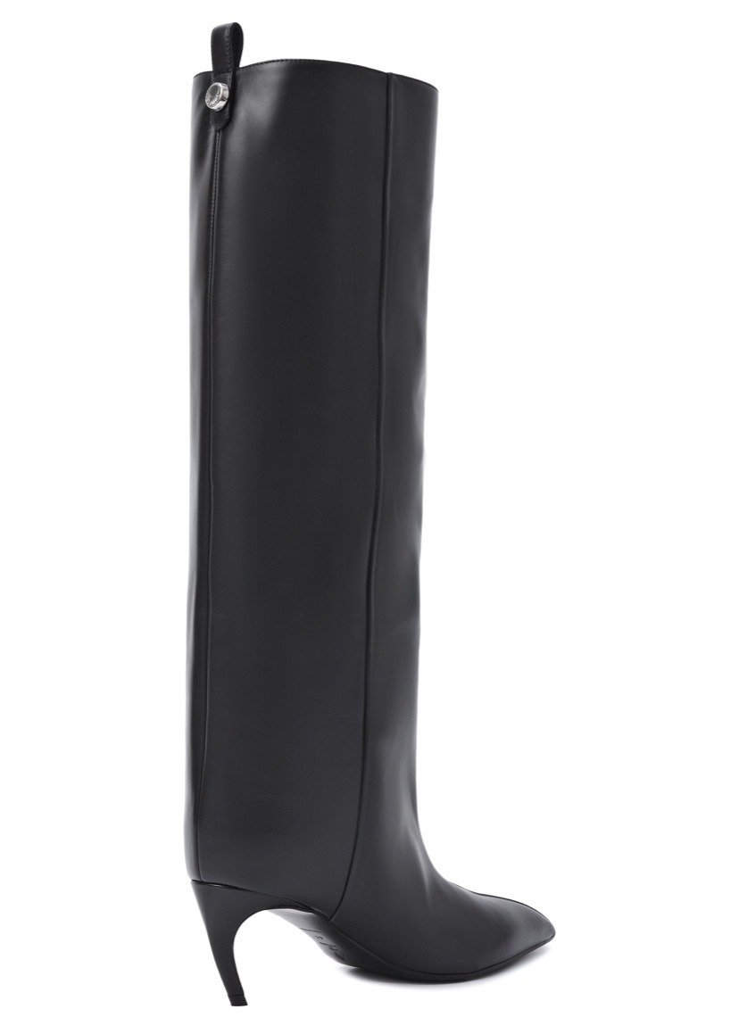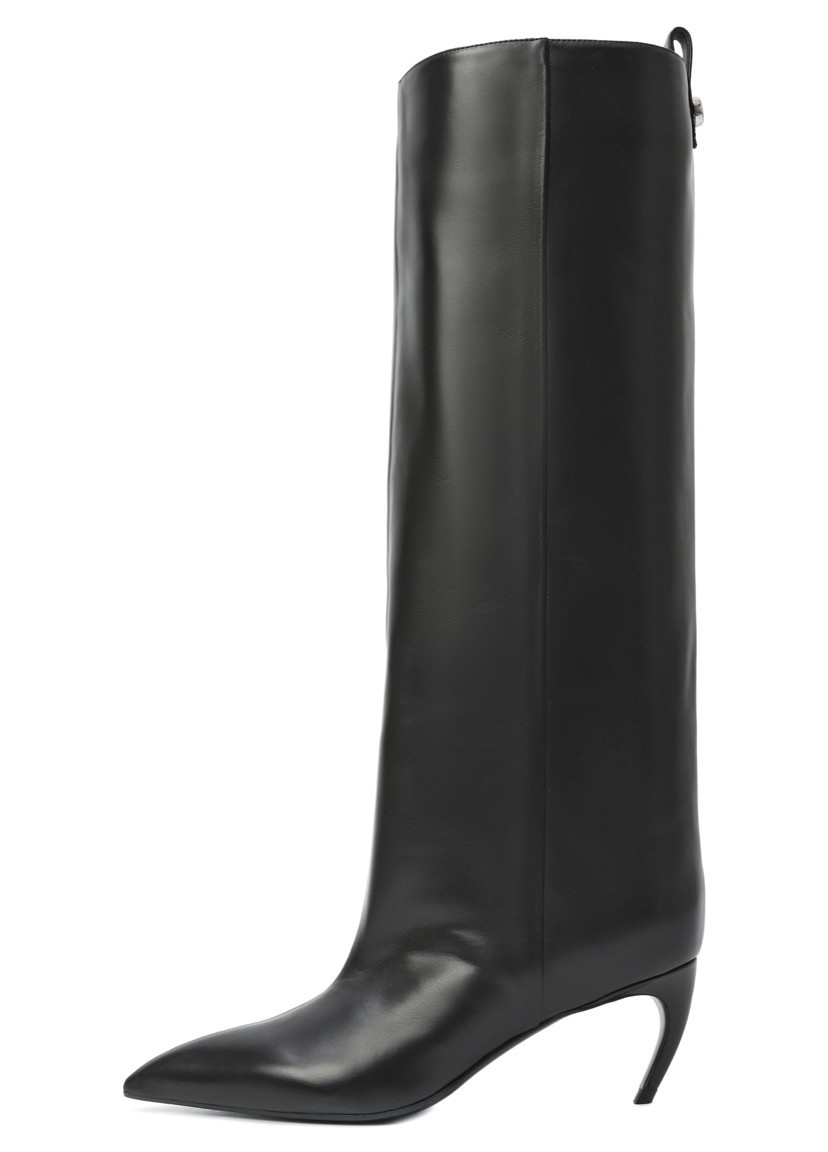 Сапоги Lea выполнили из телячьей кожи, обтянув ею и изогнутый каблук. Модель с зауженным мысом украсили фирменной заклепкой на петле, которой дополнили широкое голенище.