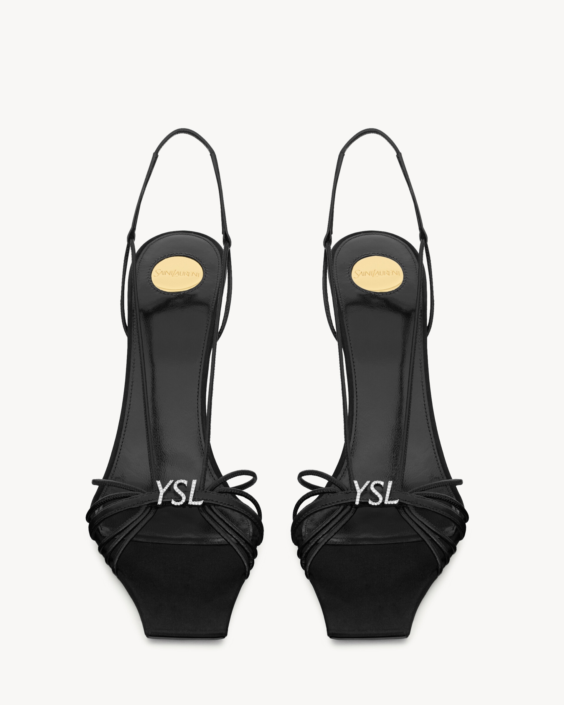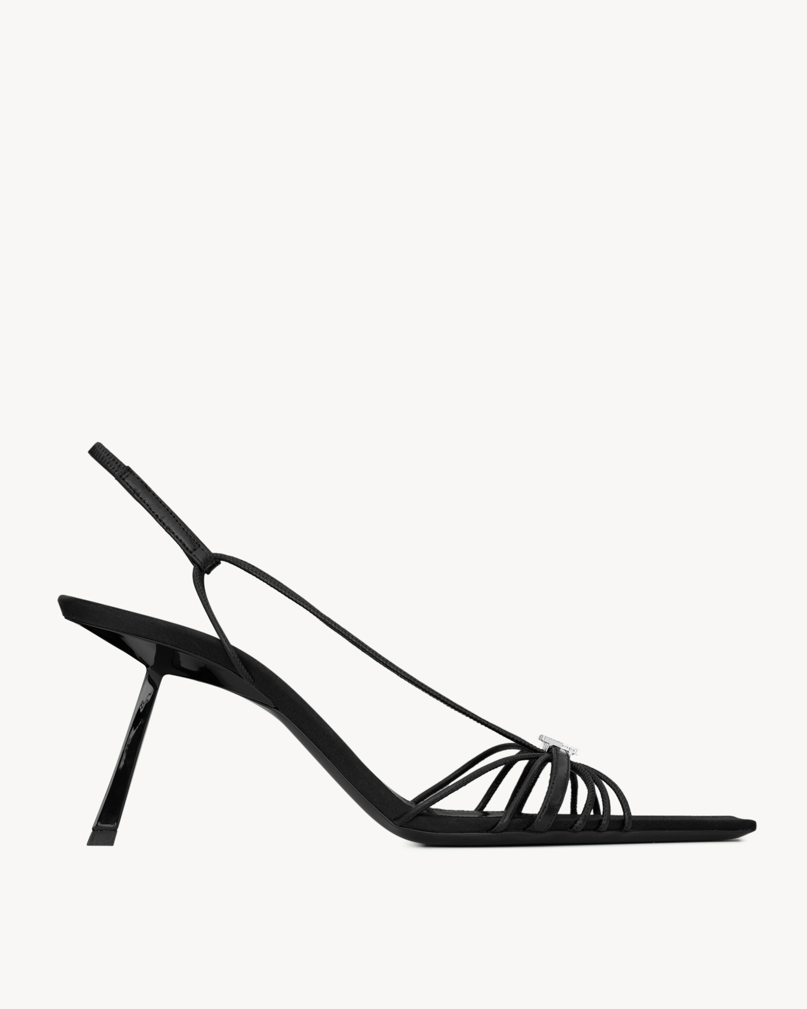 БОСОНОЖКИ НА РЕМЕШКАХ С ОТКРЫТОЙ ПЯТКОЙ, УКРАШЕННЫЕ ИНИЦИАЛАМИ YSL ИЗ СТРАЗ, С КВАДРАТНЫМ НОСКОМ И ЛАКИРОВАННЫМ ГЕОМЕТРИЧЕСКИМ КАБЛУКОМ-ШПИЛЬКОЙ.