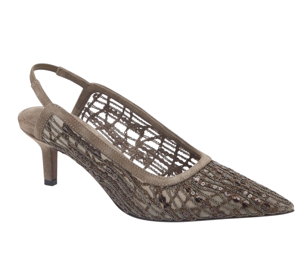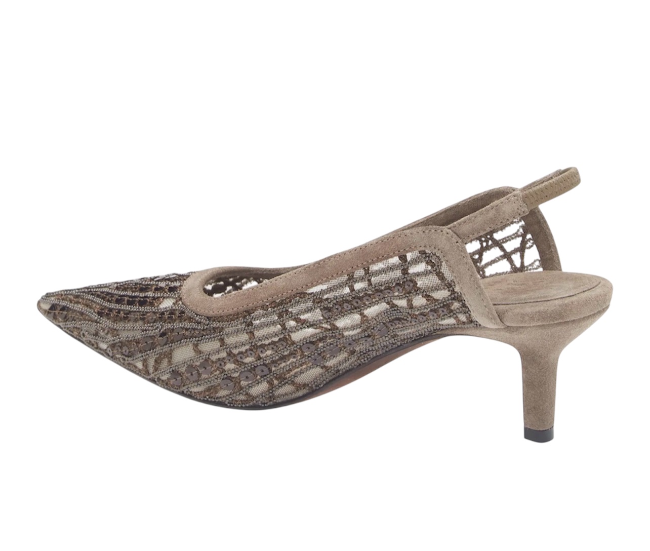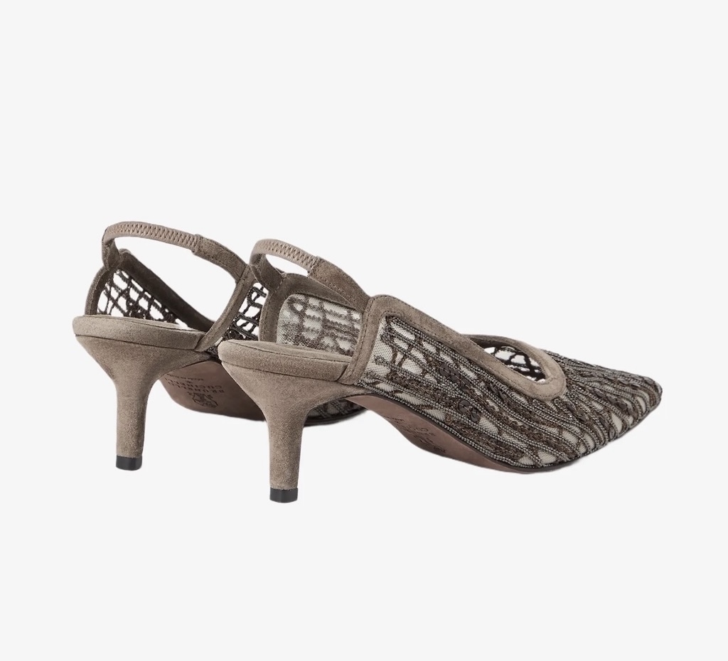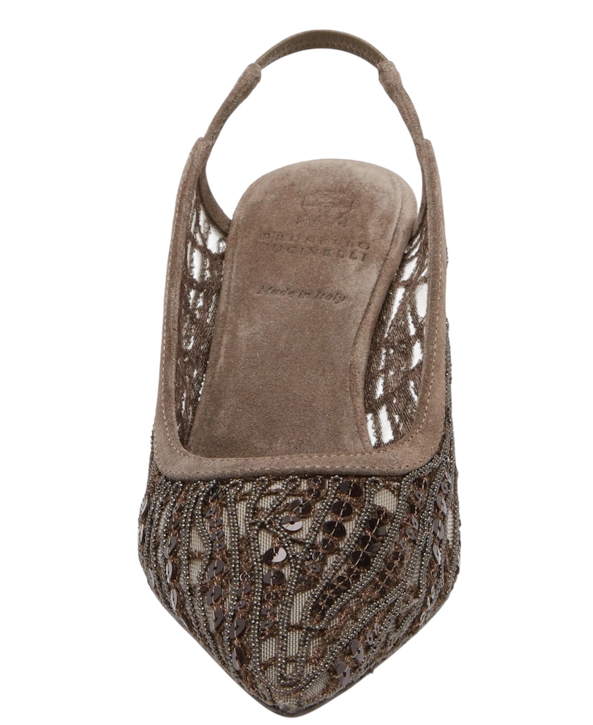 Туфли из текстиля и замши от BRUNELLO CUCINELLI. Модель с заостренным мысом, тонким каблуком комфортной высоты, открытым задником с узким эластичным ремешком. Туфли расшиты сверкающими пайетками и тонкими нитями цепочек Мониль, которые распространяют переливчатые блики по всей поверхности модели.