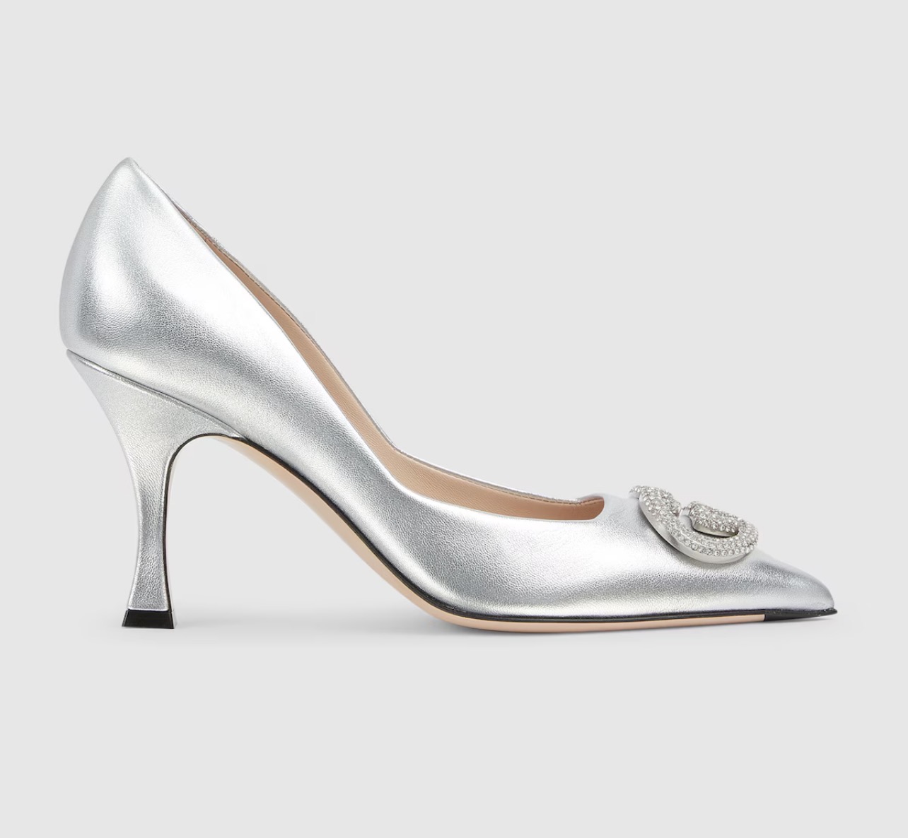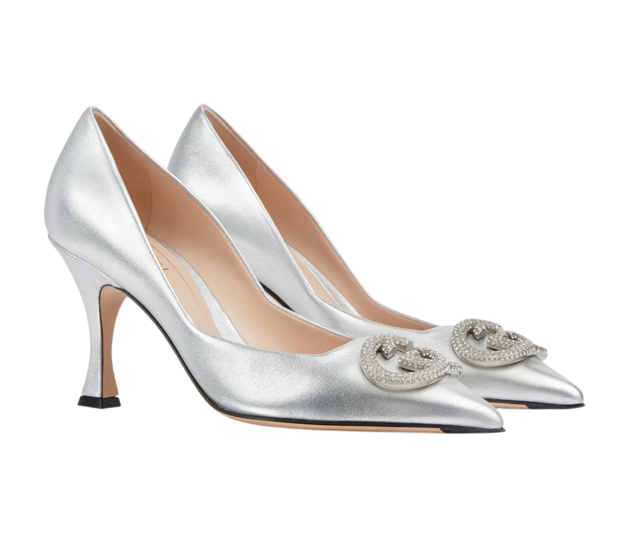 В новой коллекции женской обуви представлены вечерние модели, украшенные кристаллами в виде переплетающихся букв G, что придает этим туфлям-лодочкам сверкающий блеск.