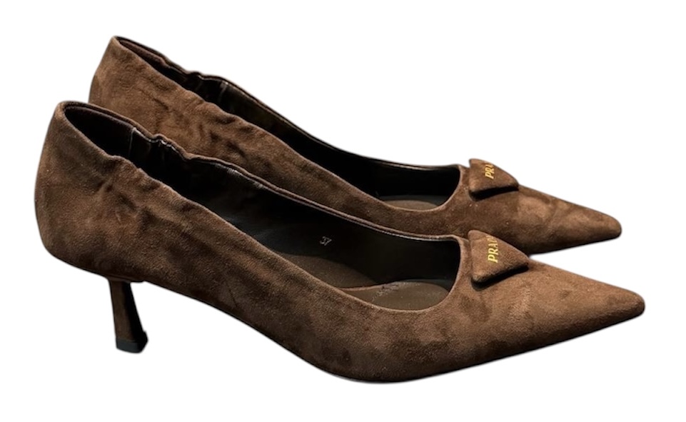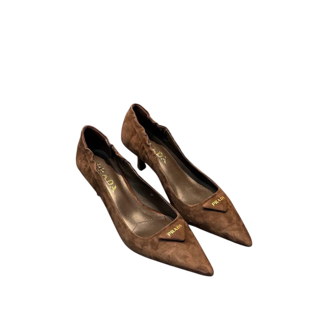 Замшевые туфли-лодочки Prada с логотипом, выполненные из замши с мягким, зауженным силуэтом. Модель имеет деконструированный носок, эластичную ленту сзади и замшевые каблук, вдохновленный геометрией характерного треугольного мотива, используемого в конструкции. Логотип нанесен методом трафаретной печати, а подошва выполнена из кожи с резиновым носком.