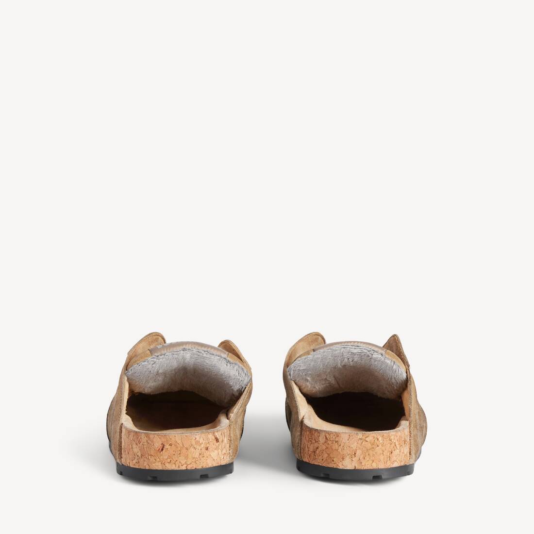 Balenciaga переосмысливает понятие повседневного стиля с помощью этих мюлей из замши и телячьей кожи, выполненных с эффектом потертости и закругленным носком для создания непринужденного образа. Детали в виде строчки в тон, фирменной нашивки с логотипом и пробковой подошвы на черной резиновой подметке делают эти мюли культовой парой без всяких сомнений.