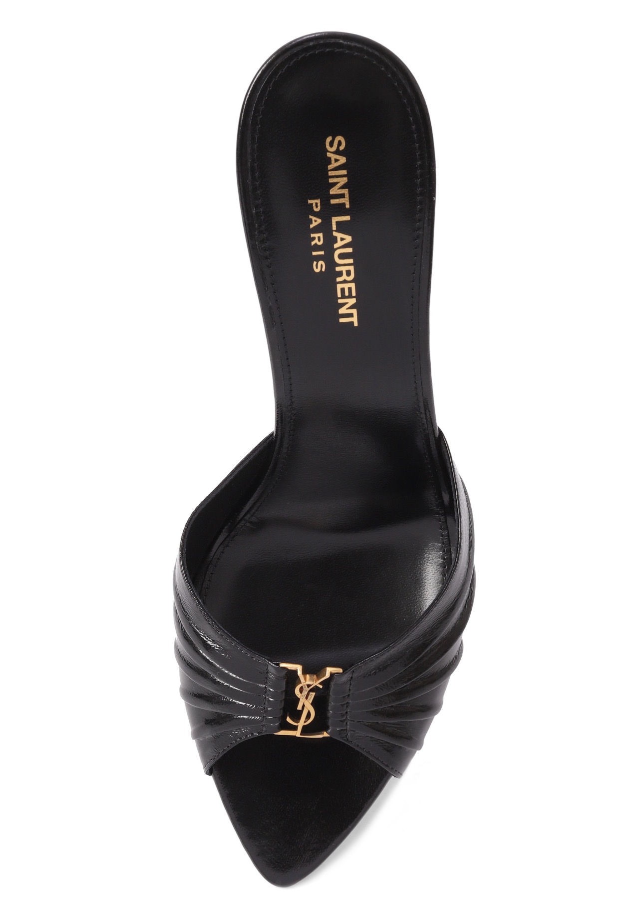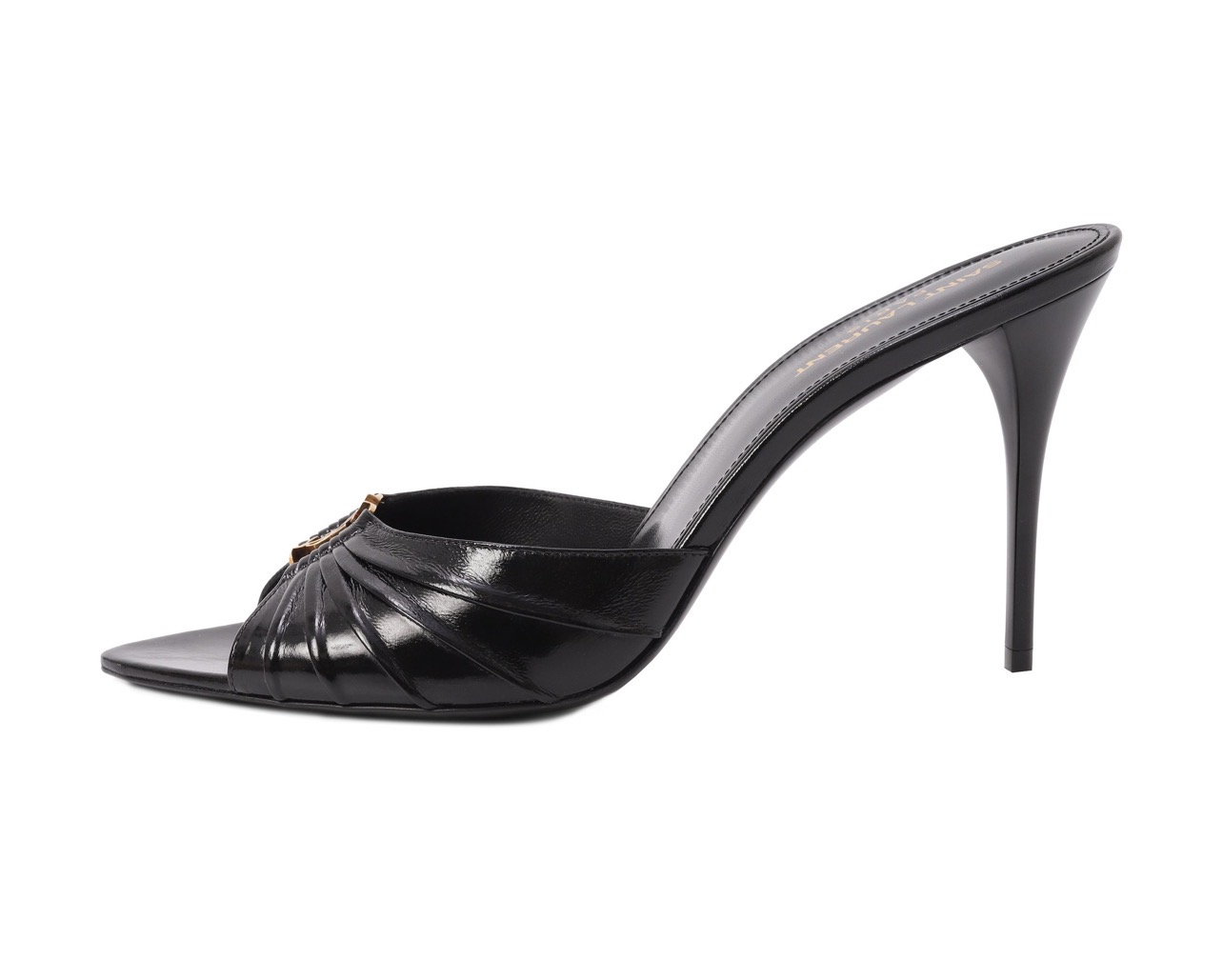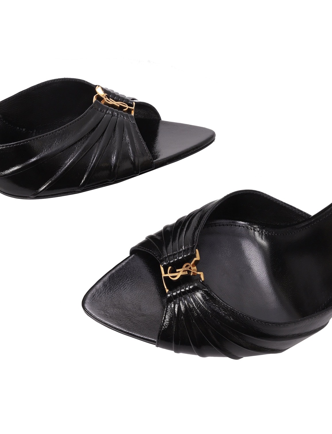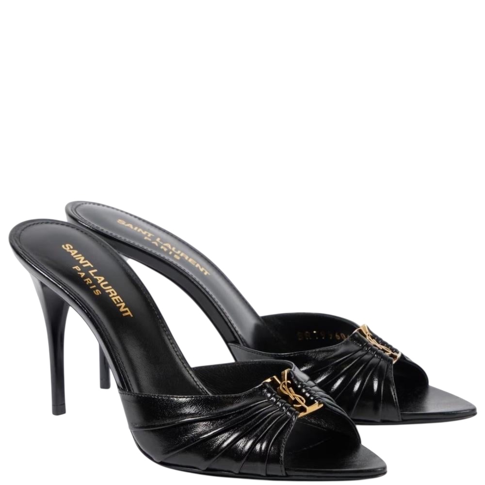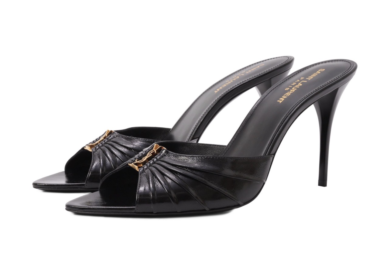 На союзке мюлей Babylone из кожи ягненка сформировали складки, заключив между ними пряжку с эмблемой Кассандра. Пару с открытым зауженным мысом поставили на высокую шпильку.