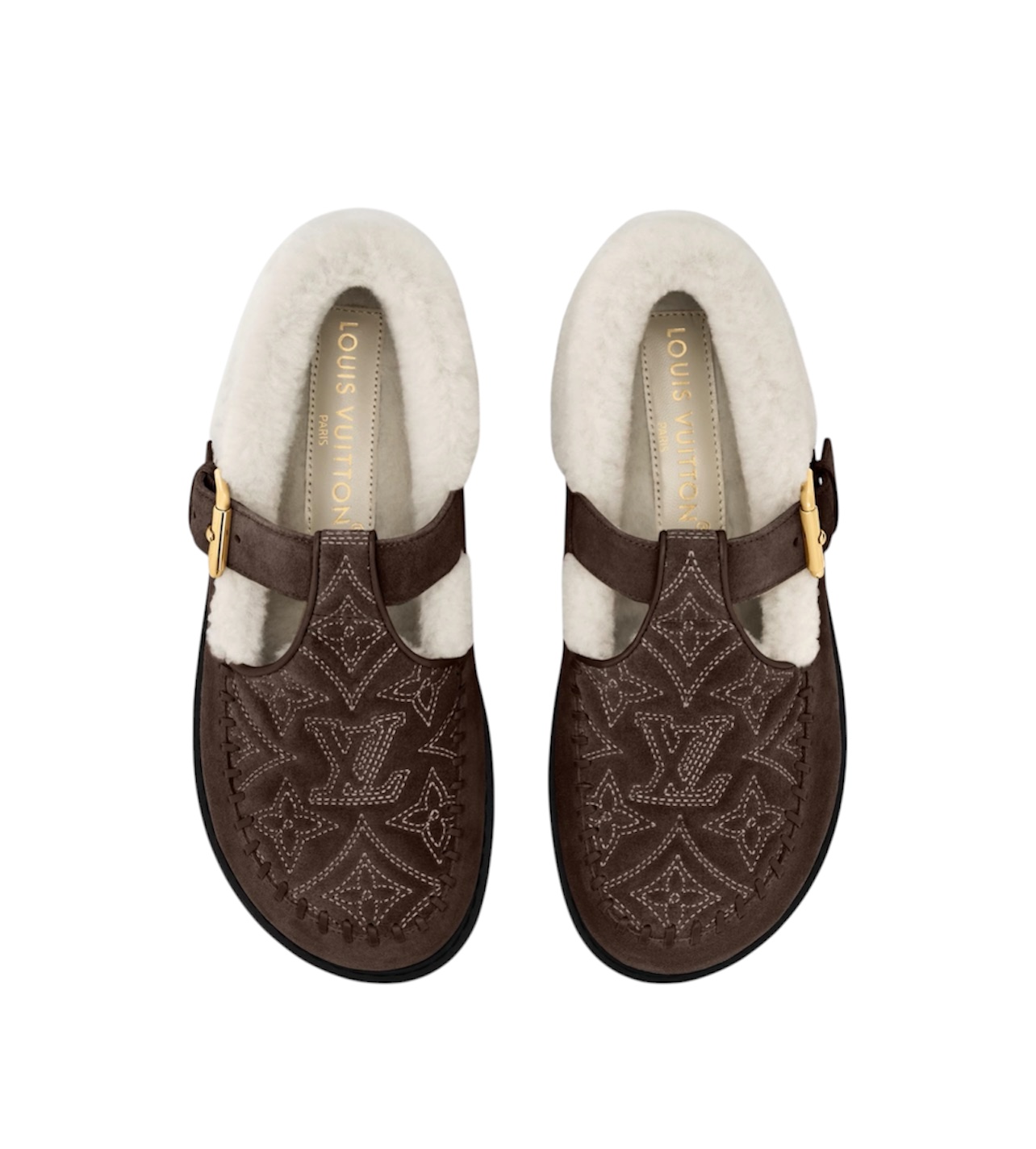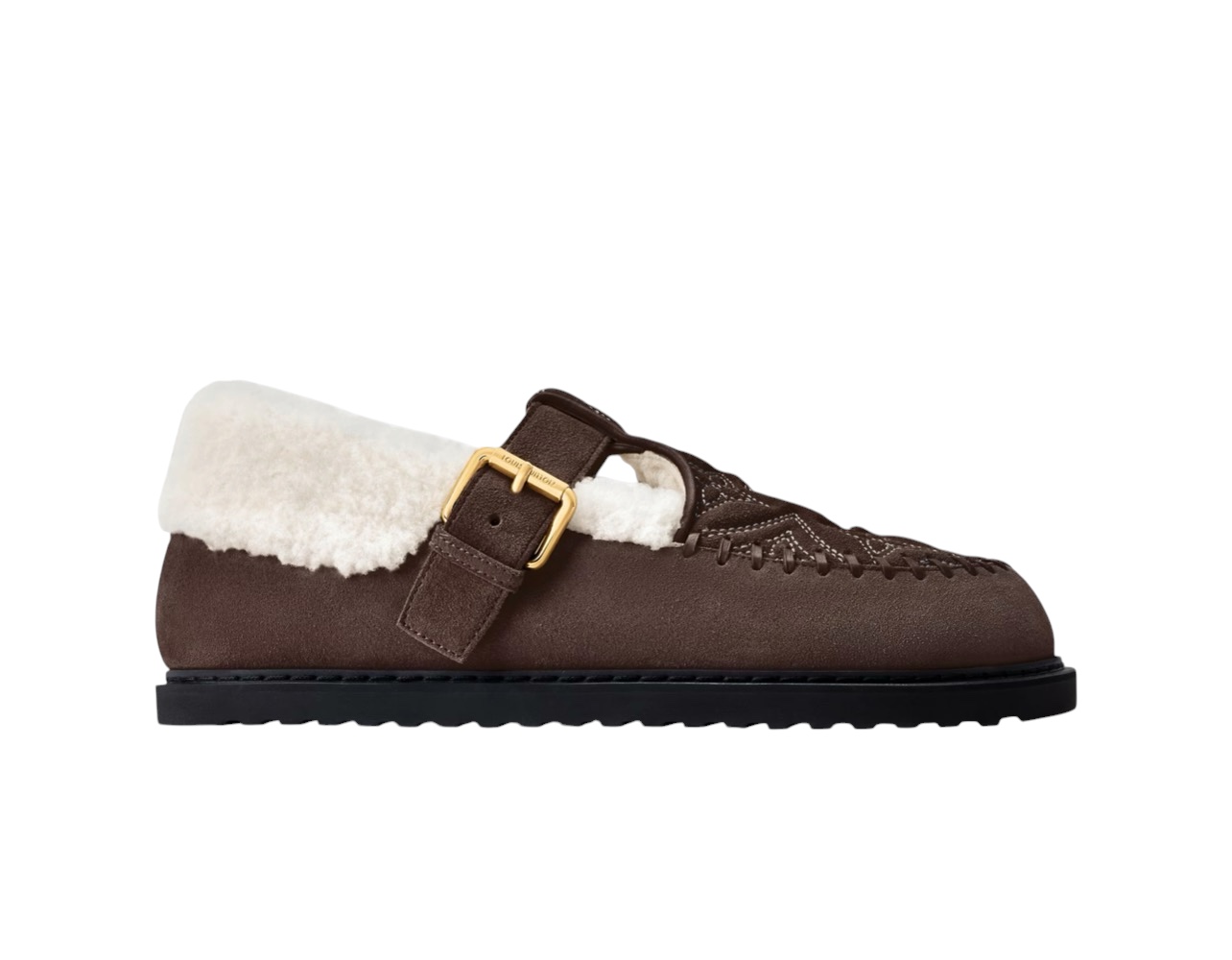 Удобные туфли-мэри-джейн Colorado выполнены из бархатистой замшевой телячьей кожи с плотной подкладкой из овчины. Верхняя часть украшена вышивкой в виде монограммы Louis Vuitton, а ремешок регулируется гравированной пряжкой золотистого цвета. Модные и удобные в носке, эти туфли дополнены легкой микроподошвой.