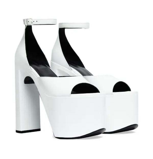 Белый, кожа, ремешок на щиколотке с пряжкой, открытый носок, кожаная стелька с логотипом, подошва на платформе и высокий блочный каблук.