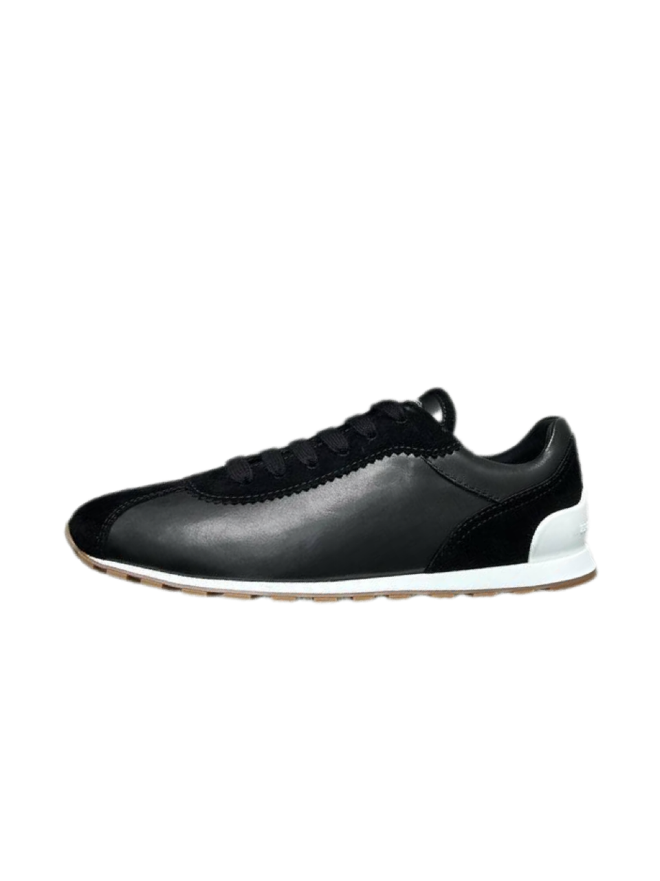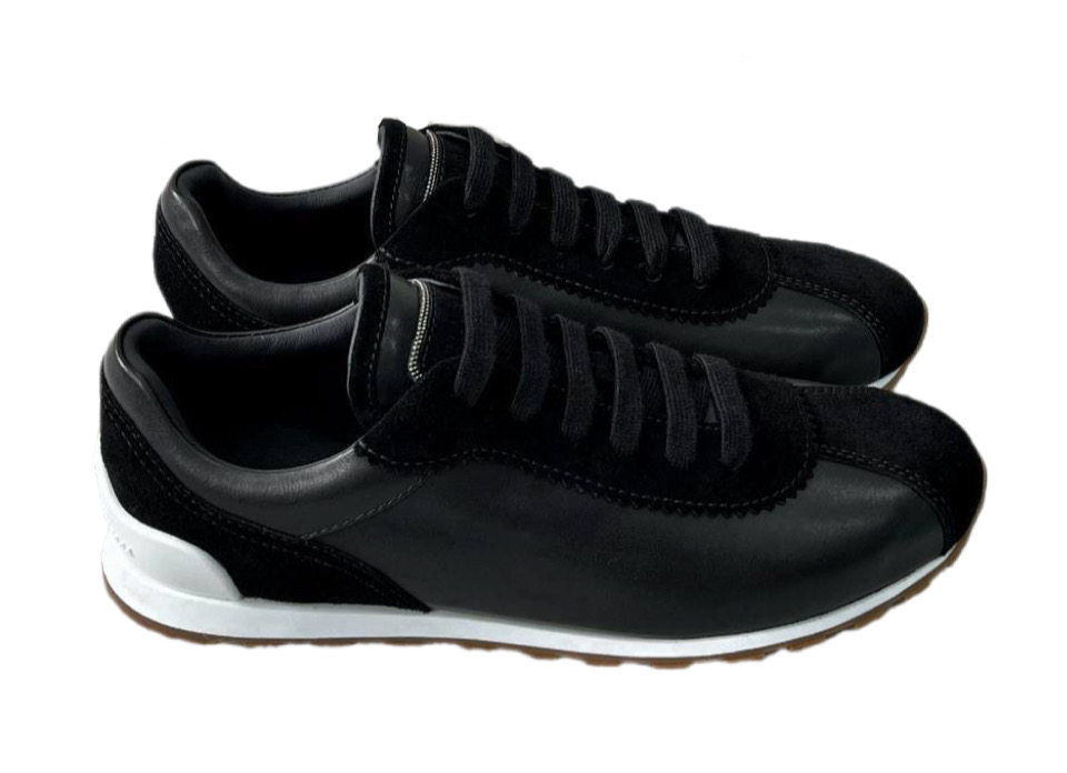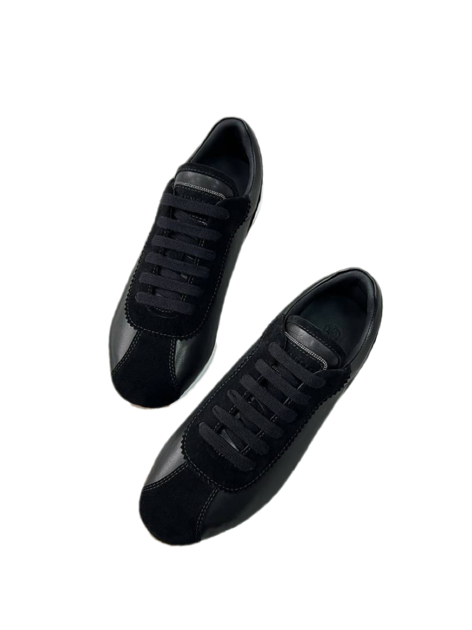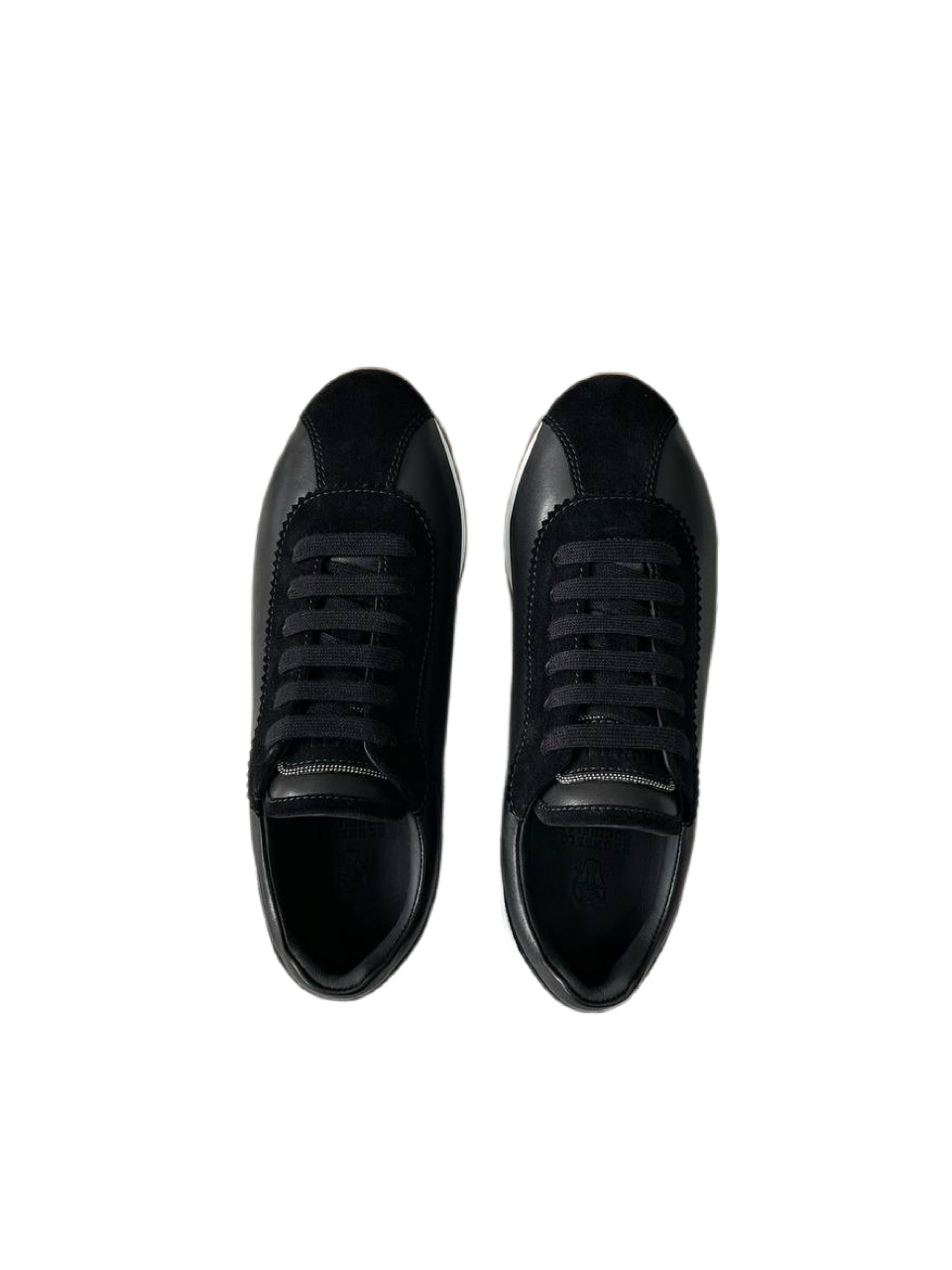 Ценные материалы и культовые детали характеризуют новые кроссовки из замши и телячьей кожи. Сочетание ценных видов кожи создает изящный текстурный контраст: гладкая на ощупь телячья кожа чередуется с бархатистой замшей, демонстрируя элегантную эстетику. Вышивка из блестящей цепочки Мониль, культовое украшение коллекций Brunello Cucinelli, добавляет женственную ноту.
