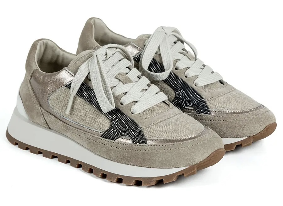 CUCINELLI. -Модель с функциональной шнуровкой, легкой подошвой с глубоким протектором, декором с рядами цепочек Мониль, задниками с логотипом бренда, внутренней отделкой. -Данная модель станет идеальным дополнением для актуальных образов.