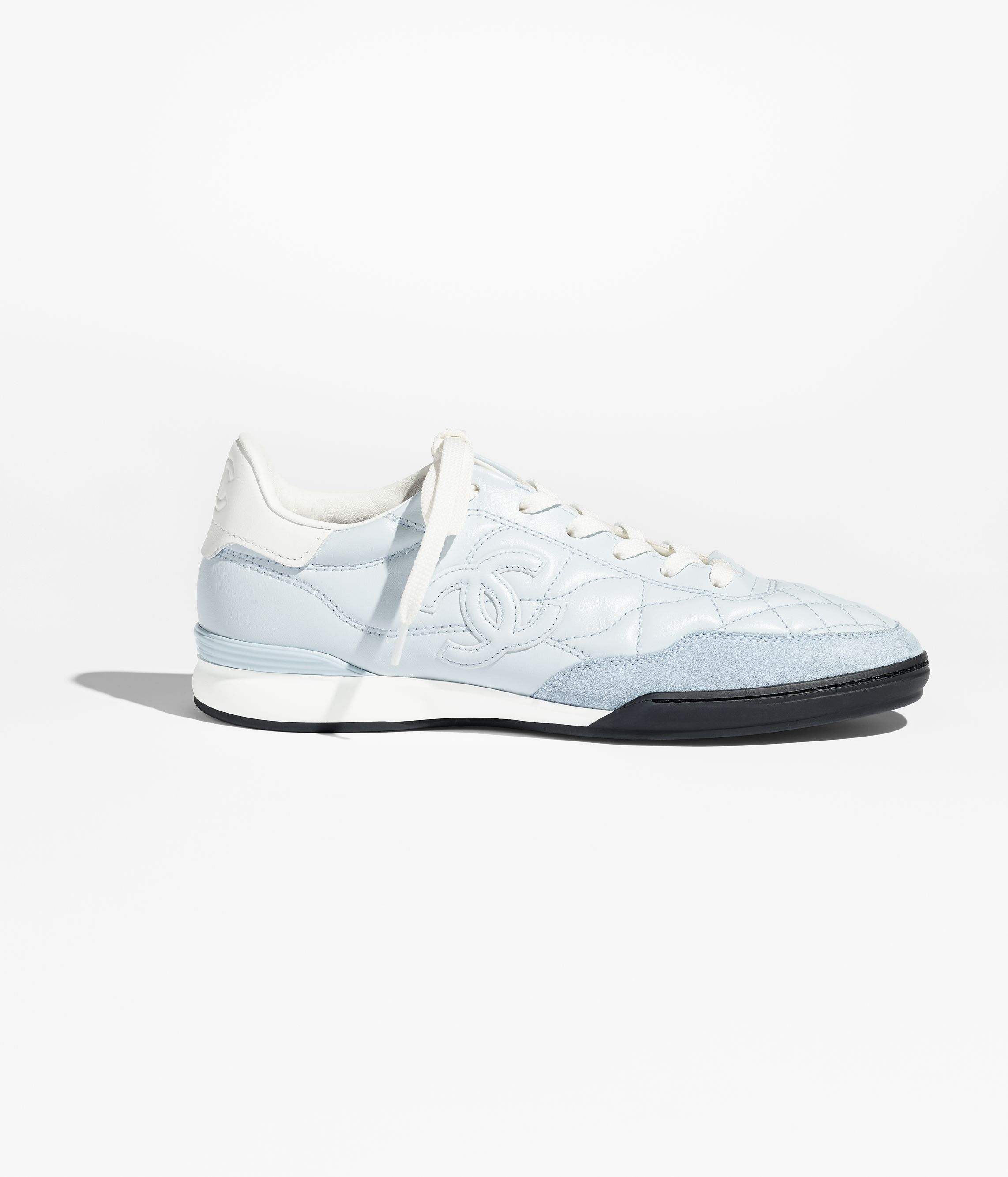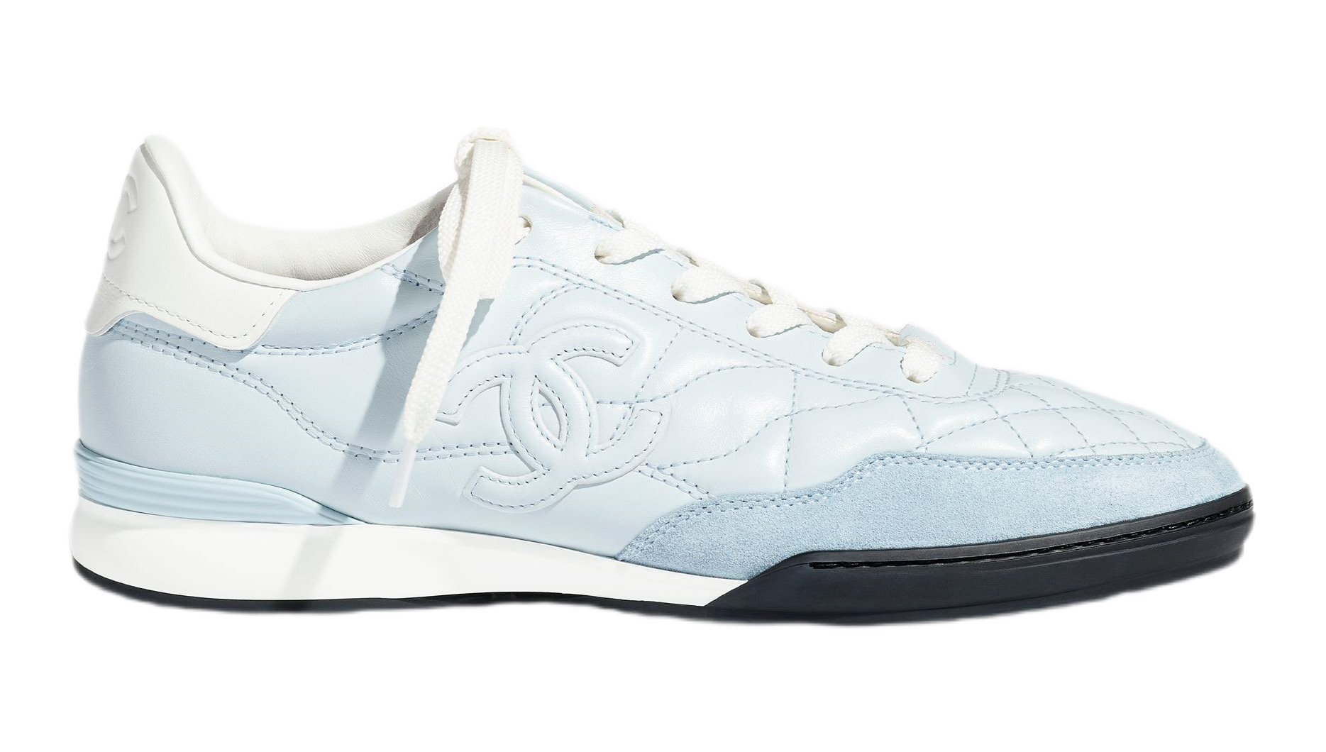 Кроссовки из коллекции Весна-Лето 2025: Кроссовки из блестящей телячьей кожи, телячьей кожи и замши, светло-желтого и белого цветов.