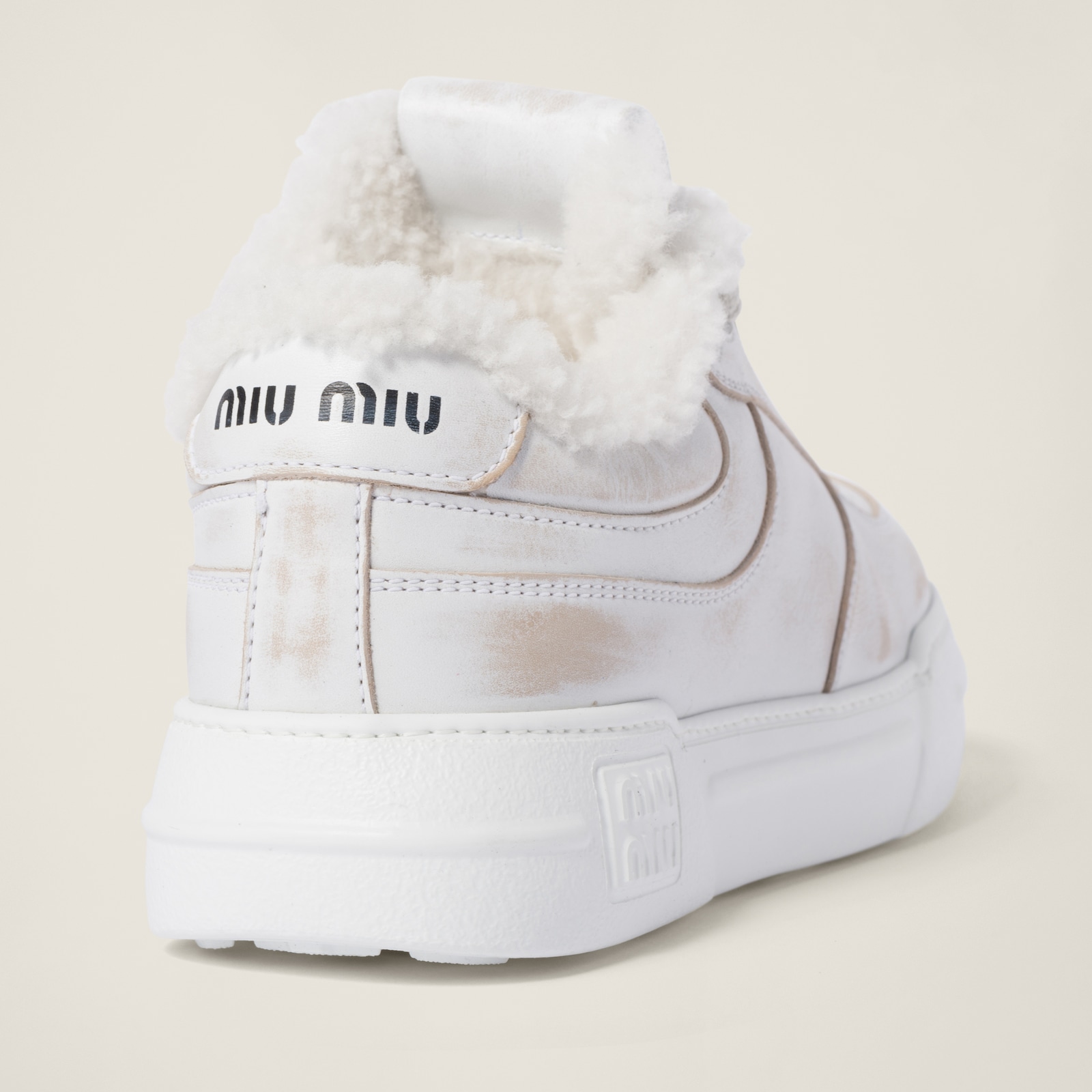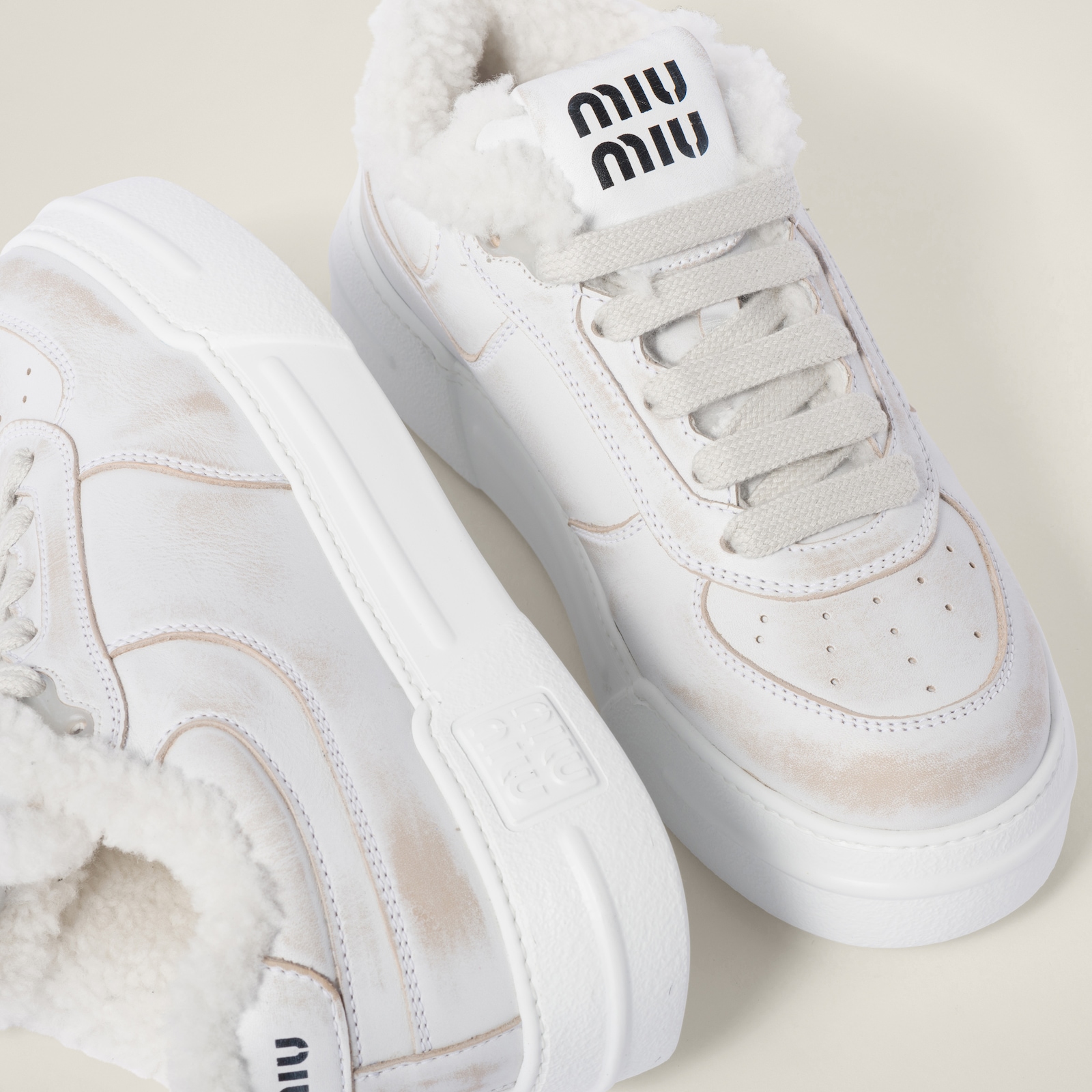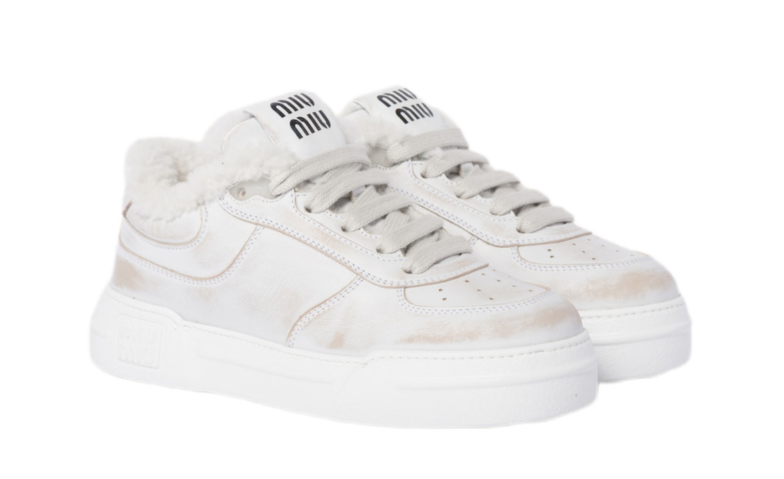 Повседневный характер классических кроссовок сочетается с мягкостью овчины. Знаменитый логотип Miu Miu контрастного цвета добавляет фирменный штрих этому стилю.
